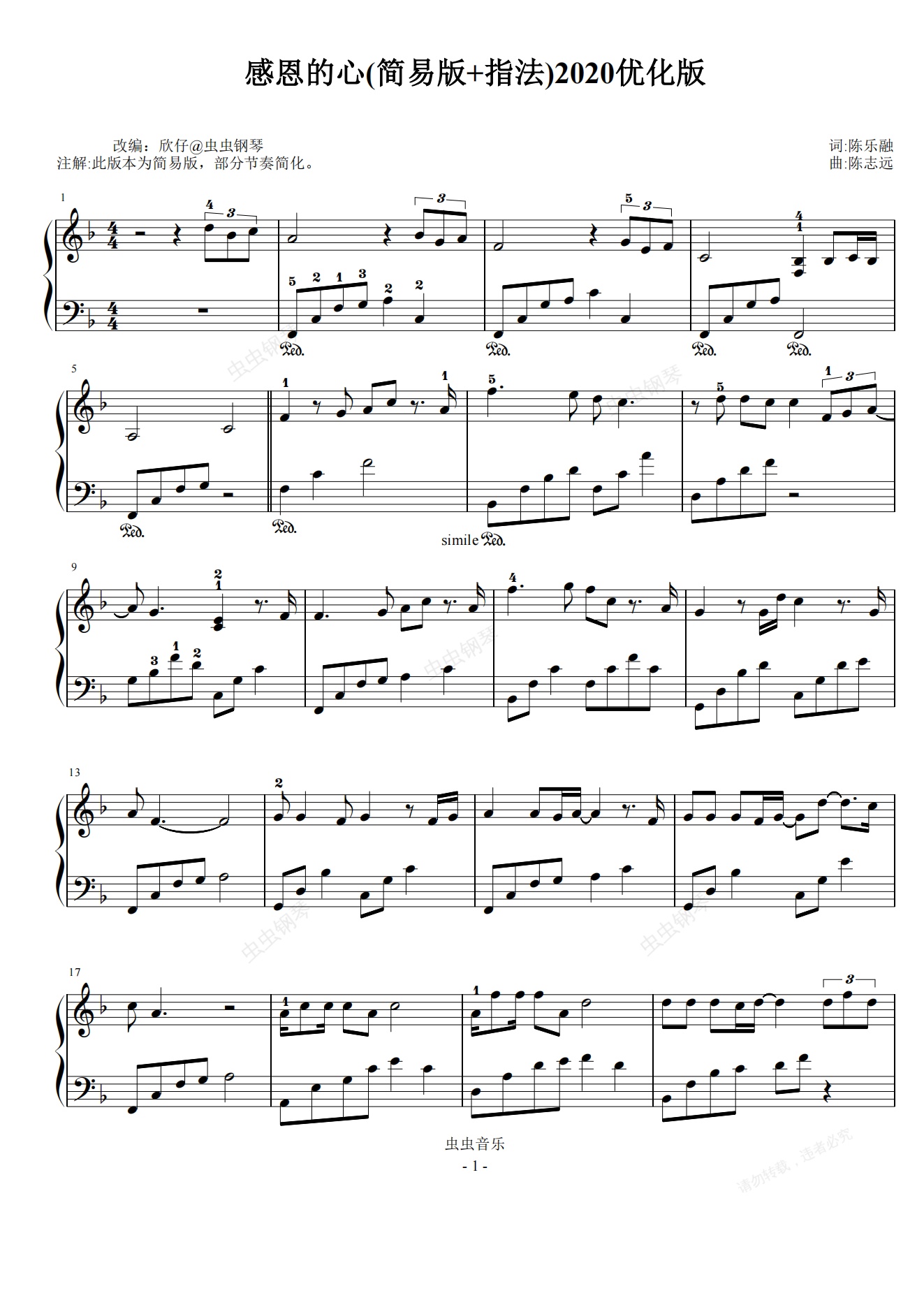 钢琴谱:感恩的心(简易版+带指法 2020优化)
