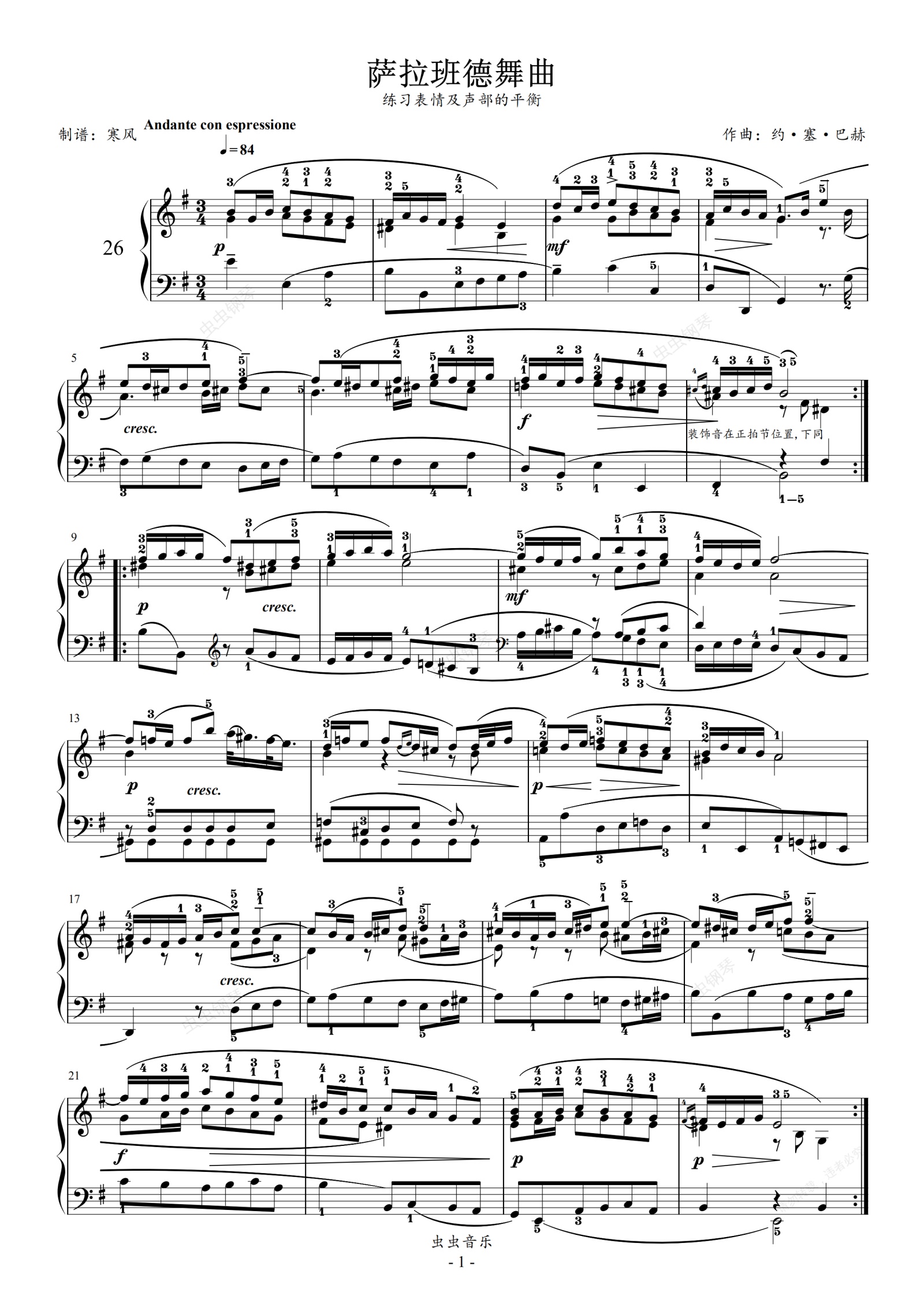 钢琴谱:巴赫初级26-萨拉班德舞曲