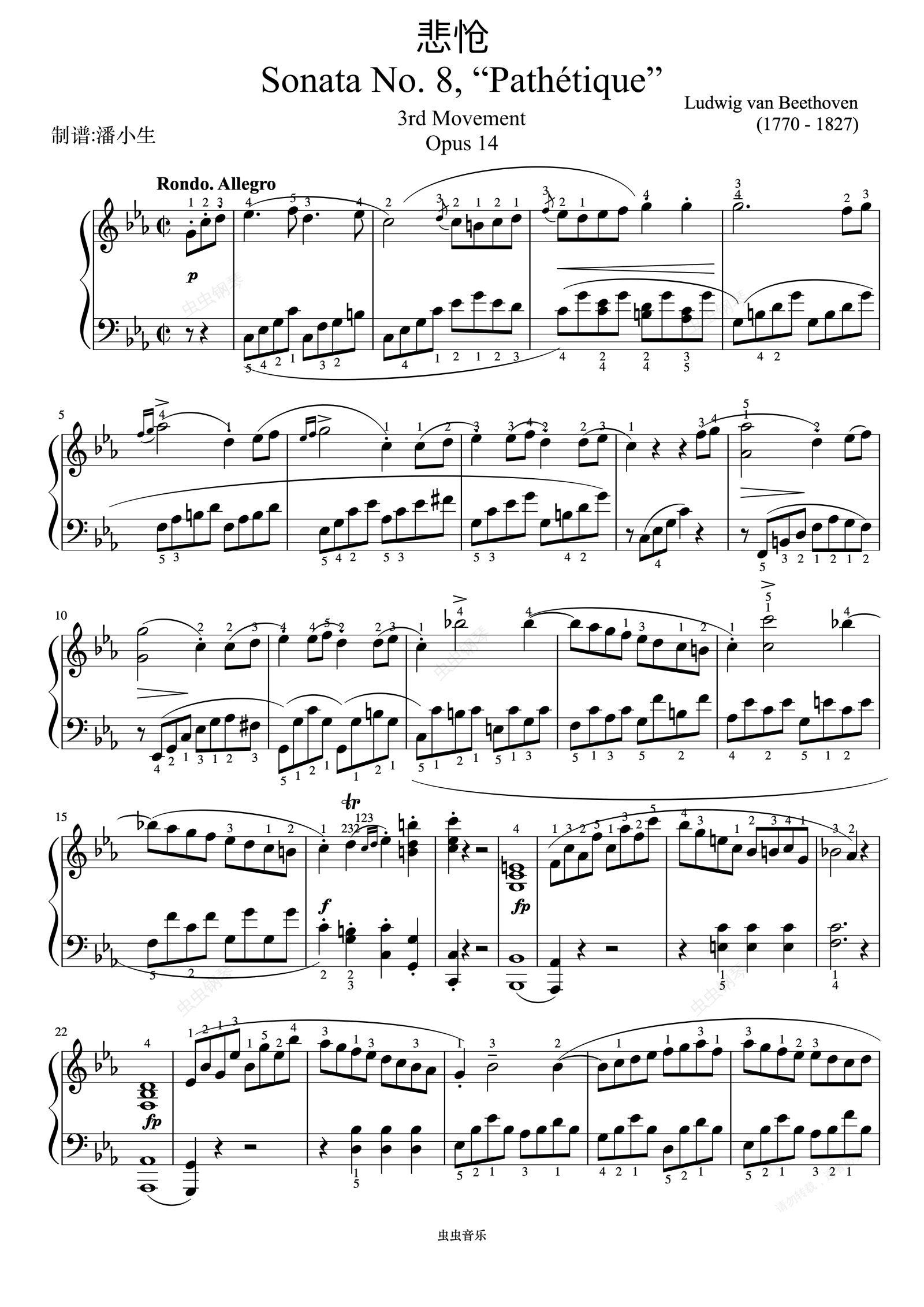 钢琴谱:贝多芬 c小调第八号钢琴奏鸣曲《悲怆》第三乐章 Op.13 No.8  高清带指法