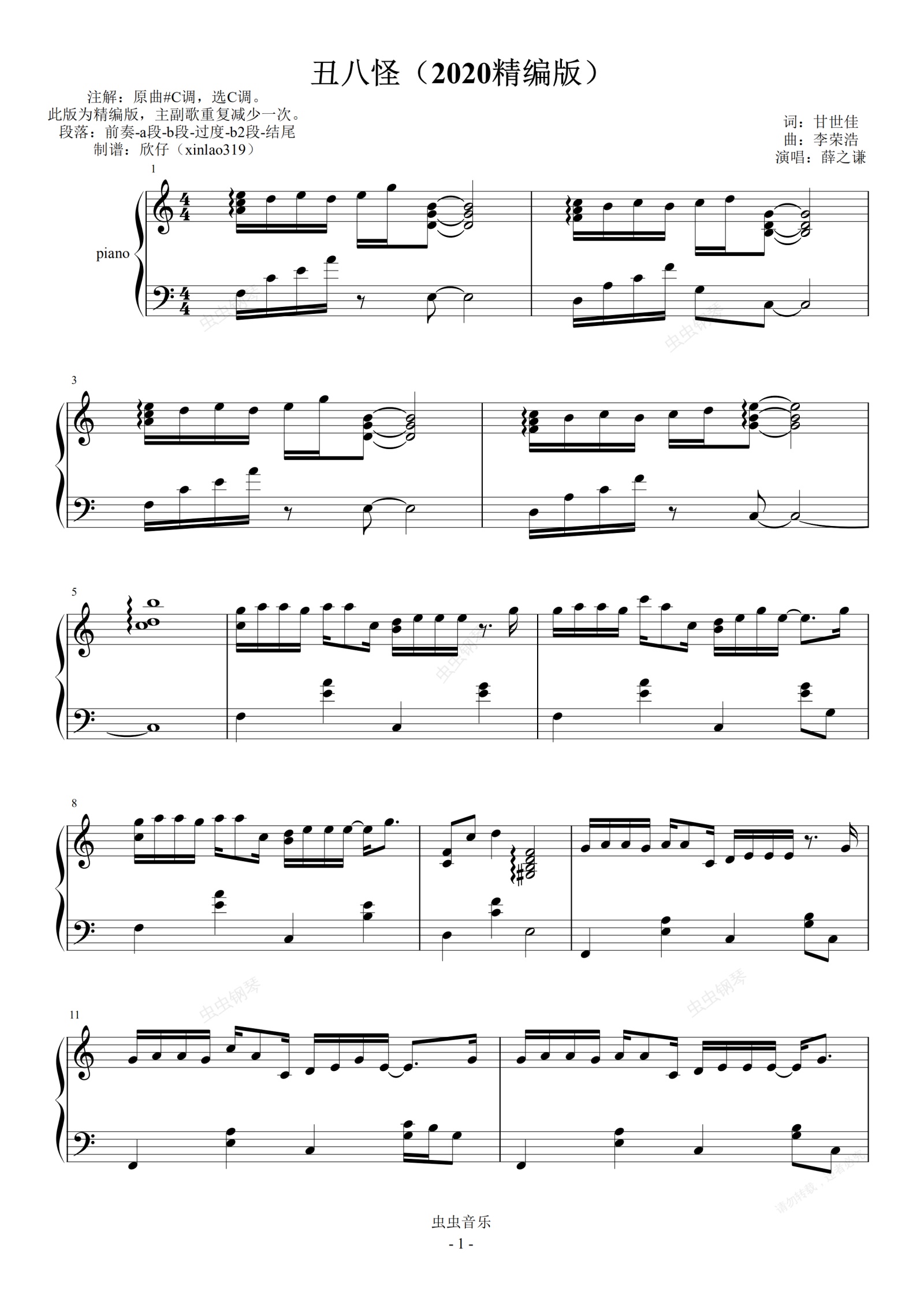 钢琴谱:丑八怪(C调2020优化精编版)