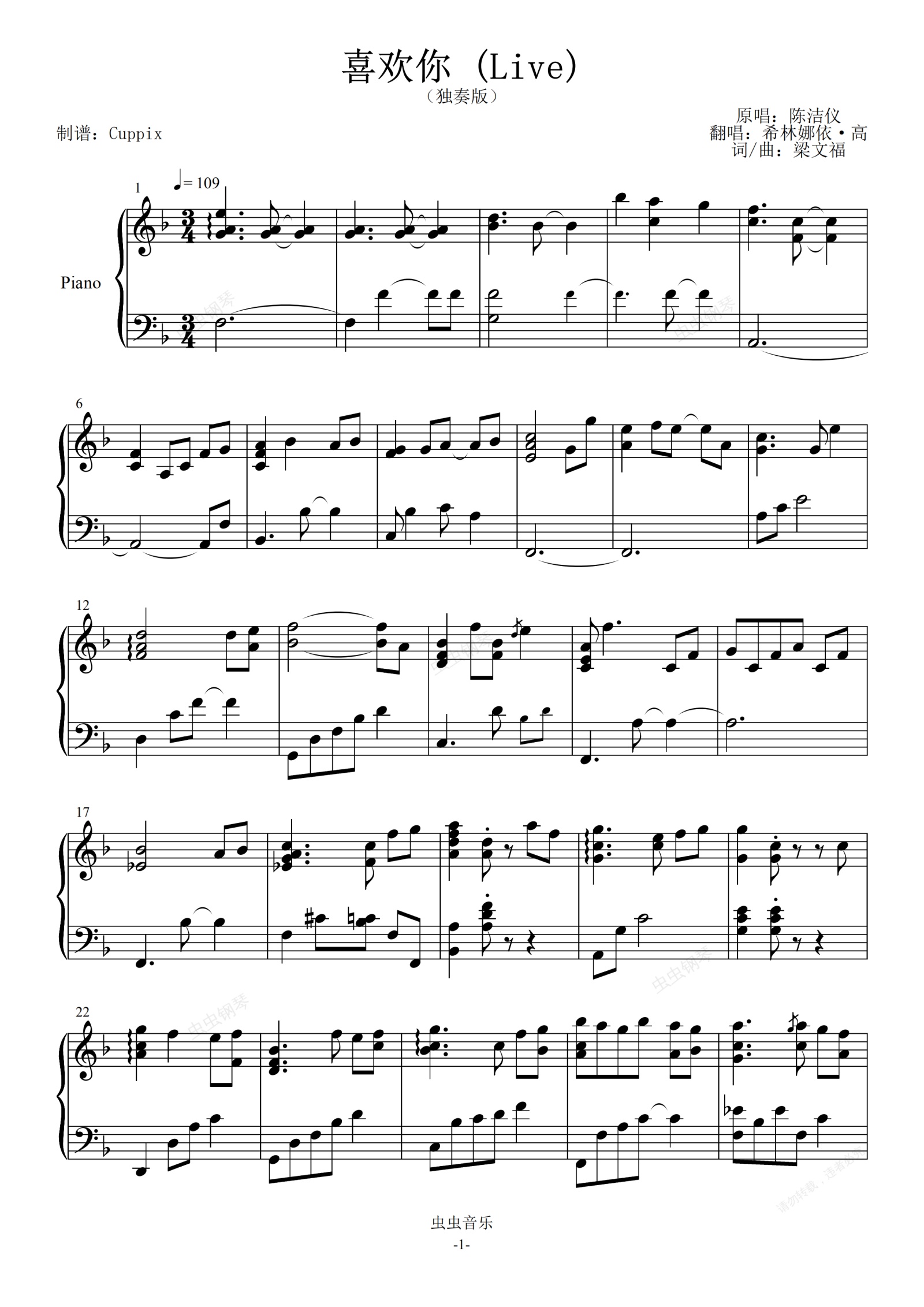 钢琴谱:希林娜依·高 《喜欢你》高度还原 独奏版