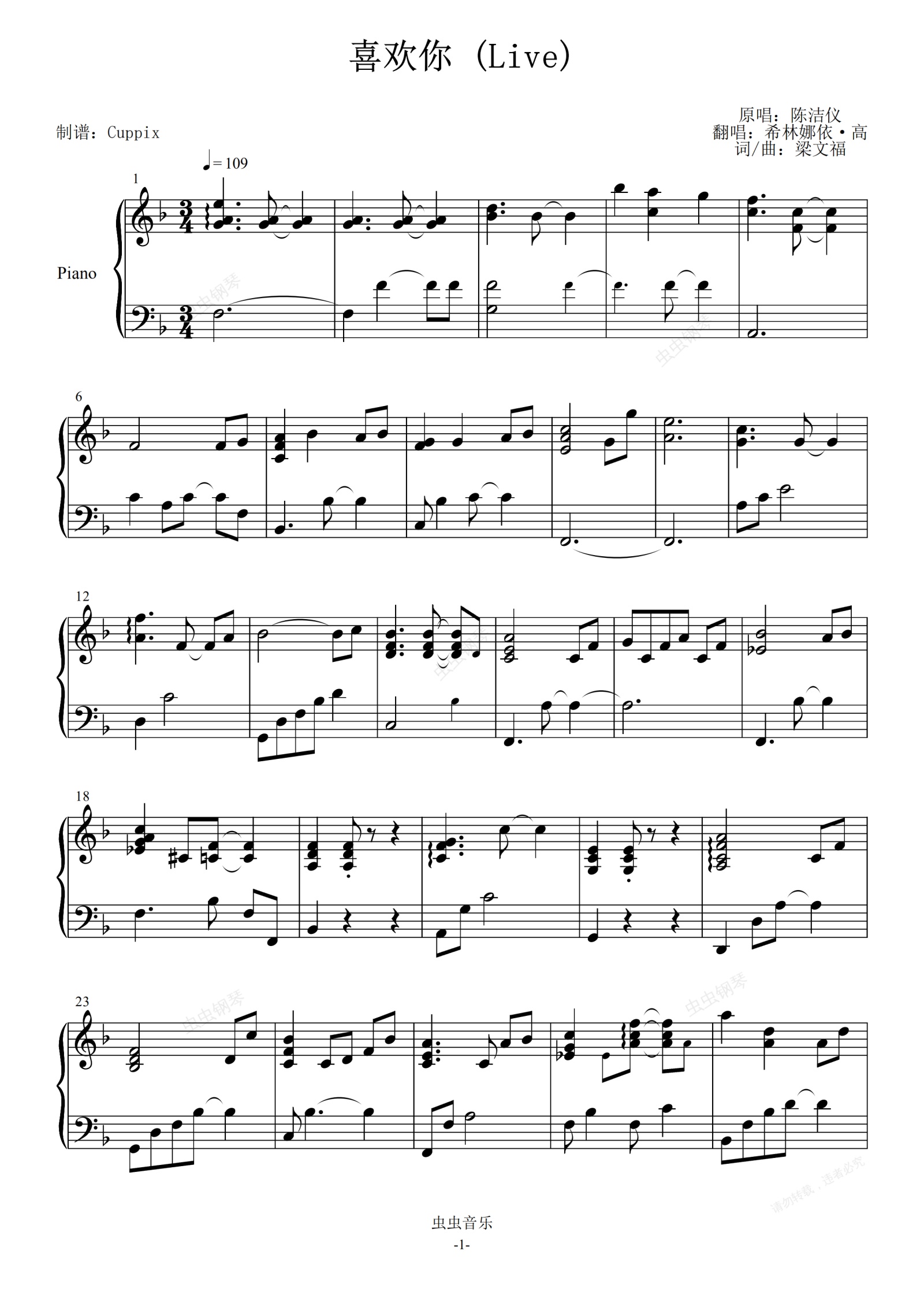 钢琴谱:希林娜依·高 《喜欢你 (Live)》弹唱伴奏