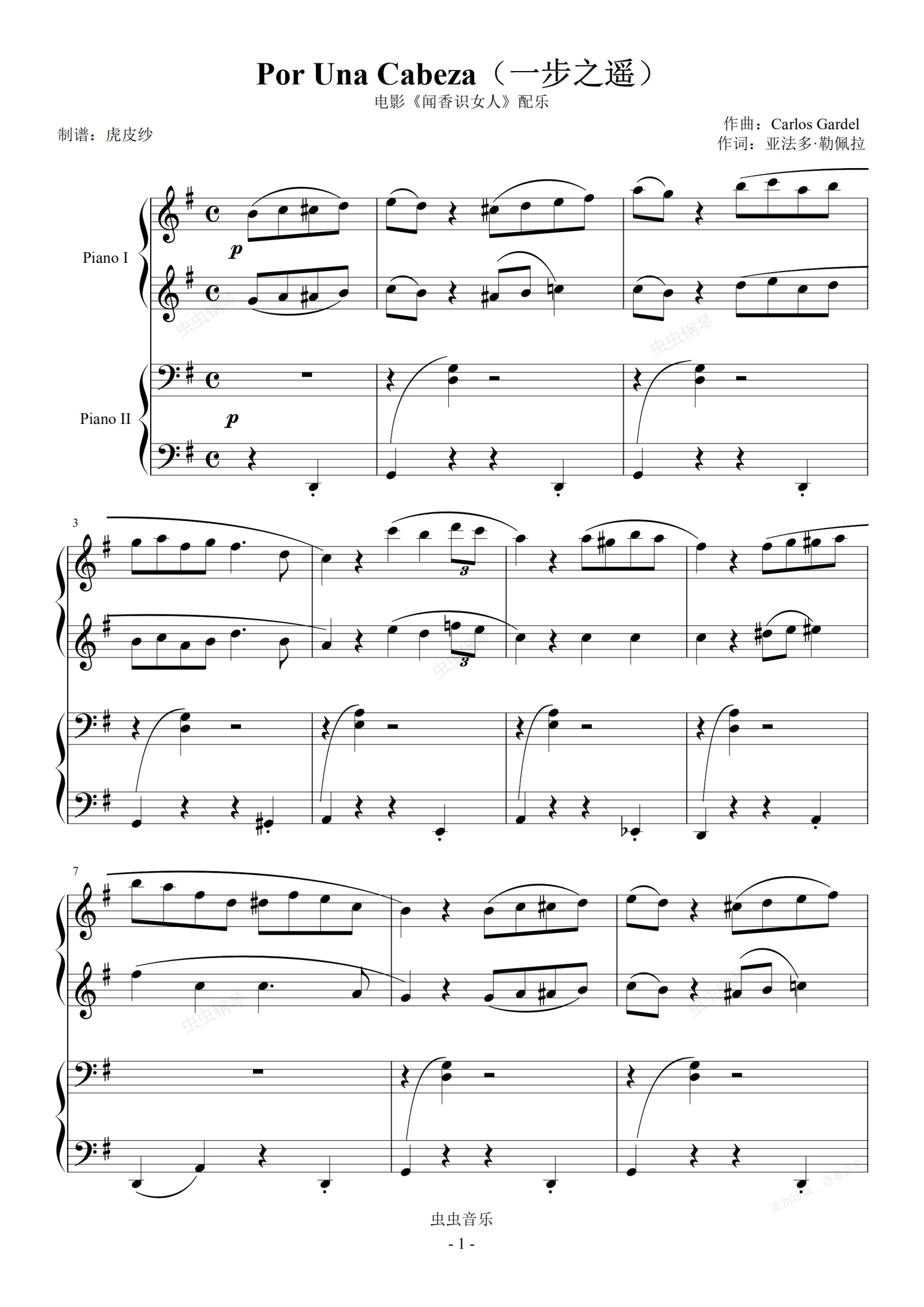钢琴谱:探戈:一步之遥 Por Una Cabeza四手联弹版本