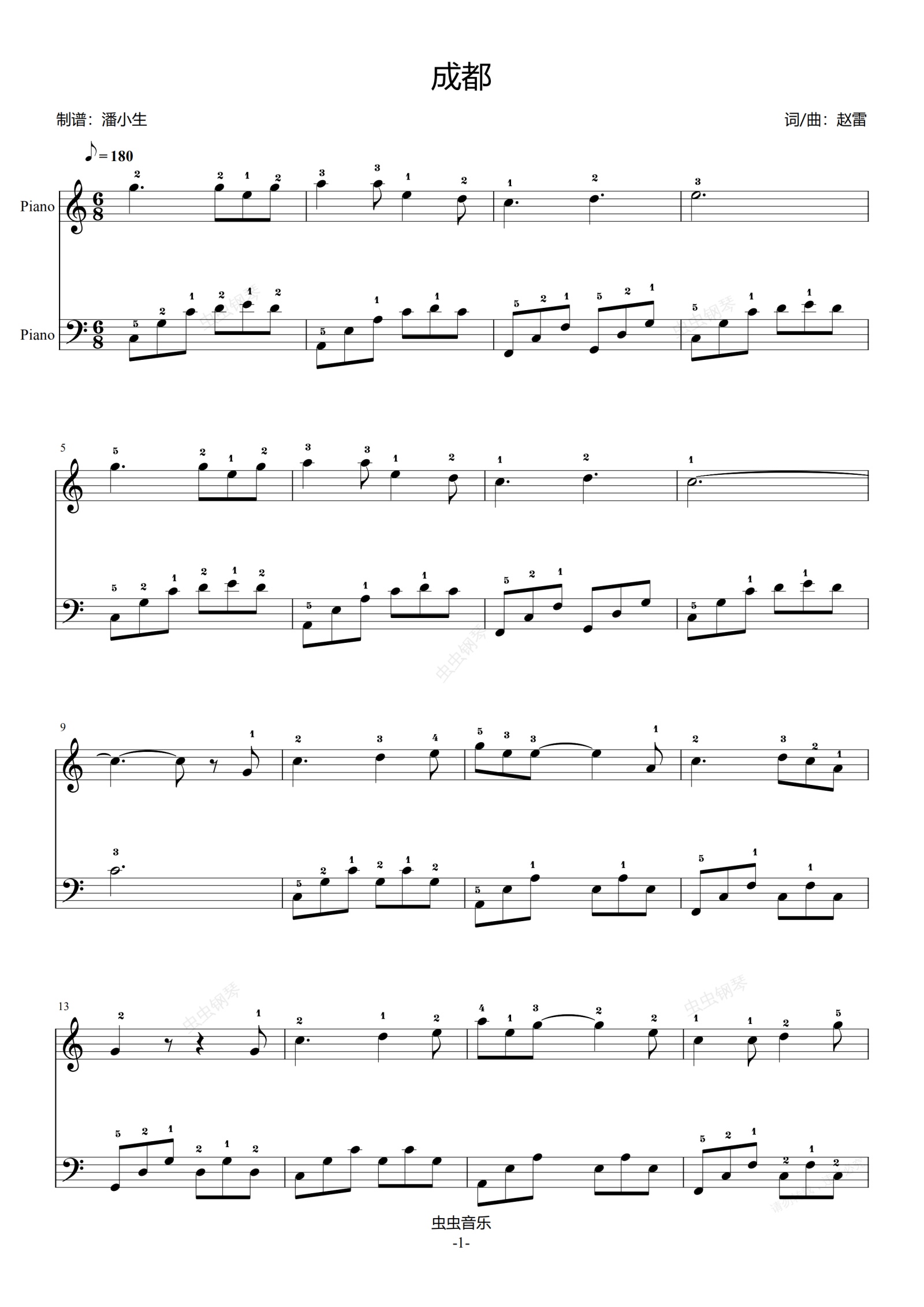 钢琴谱:成都 C调 完整指法 初学者优选 简易版