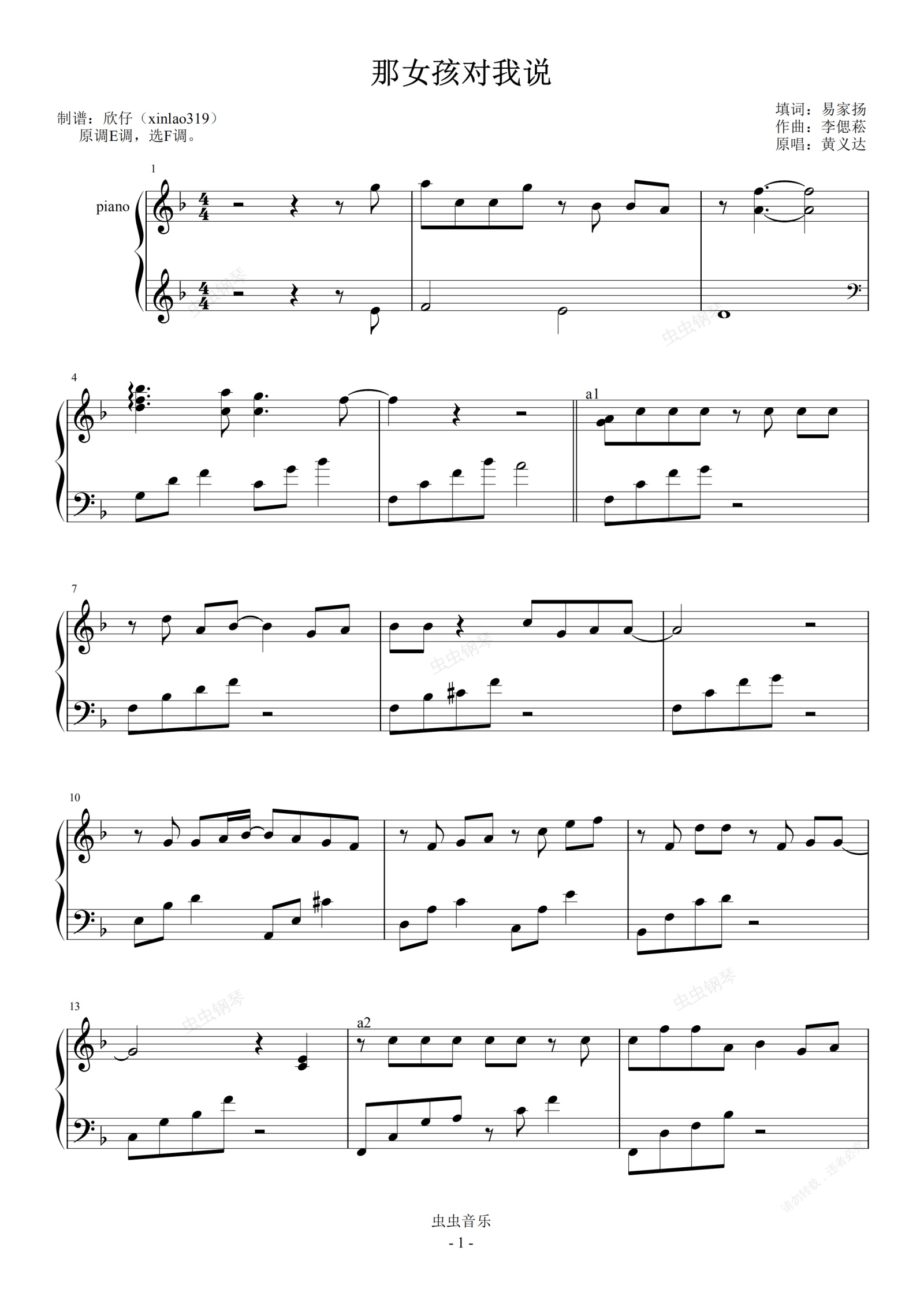 钢琴谱:那女孩对我说F(精编优化)