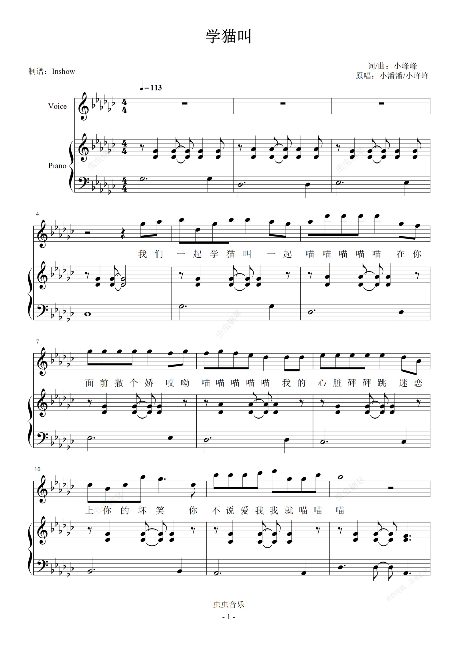 钢琴谱:小潘潘、小峰峰 - 学猫叫【弹唱谱】