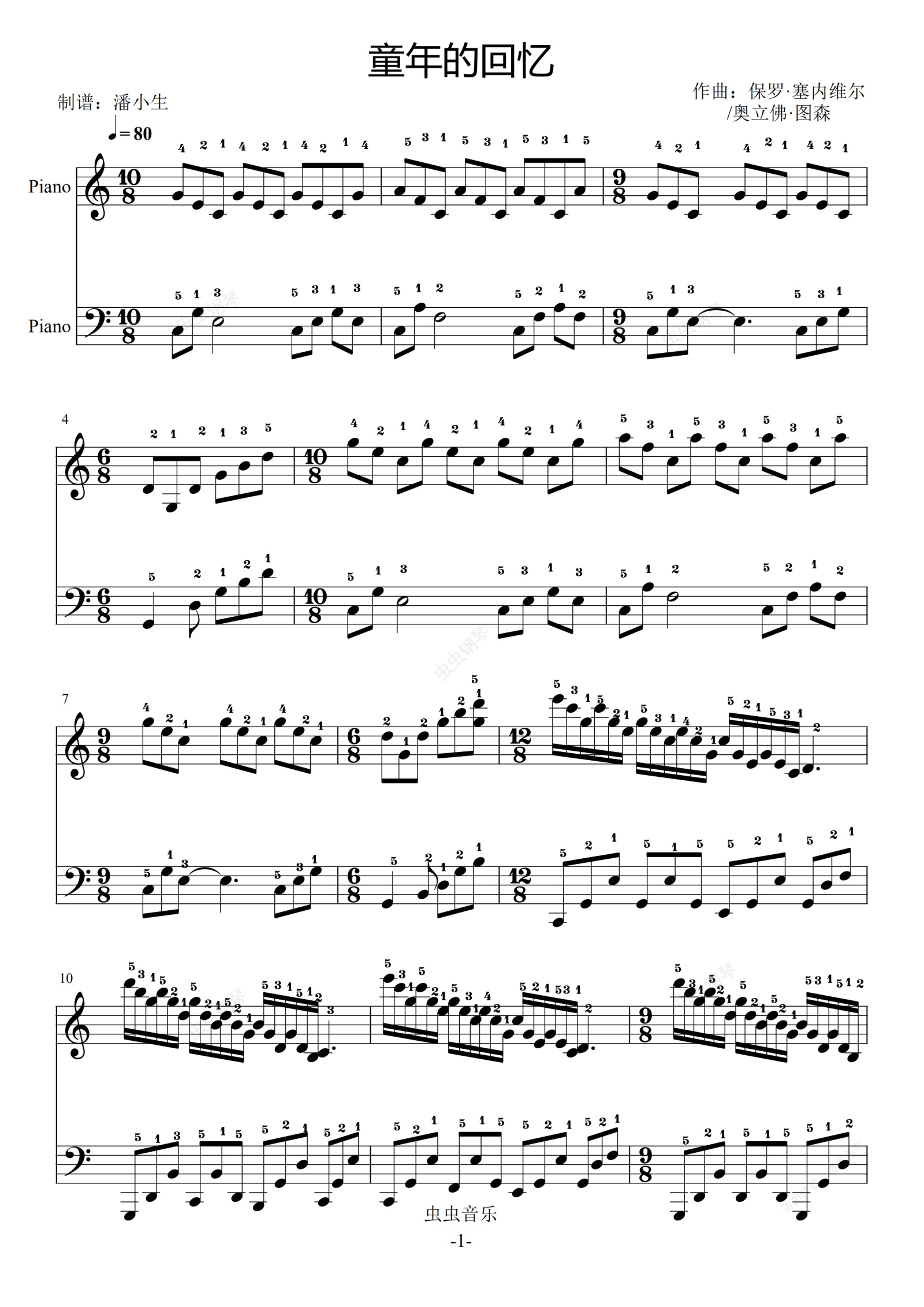 钢琴谱:童年的回忆 完整指法 C调 初学者优选 简化版 爱的纪念