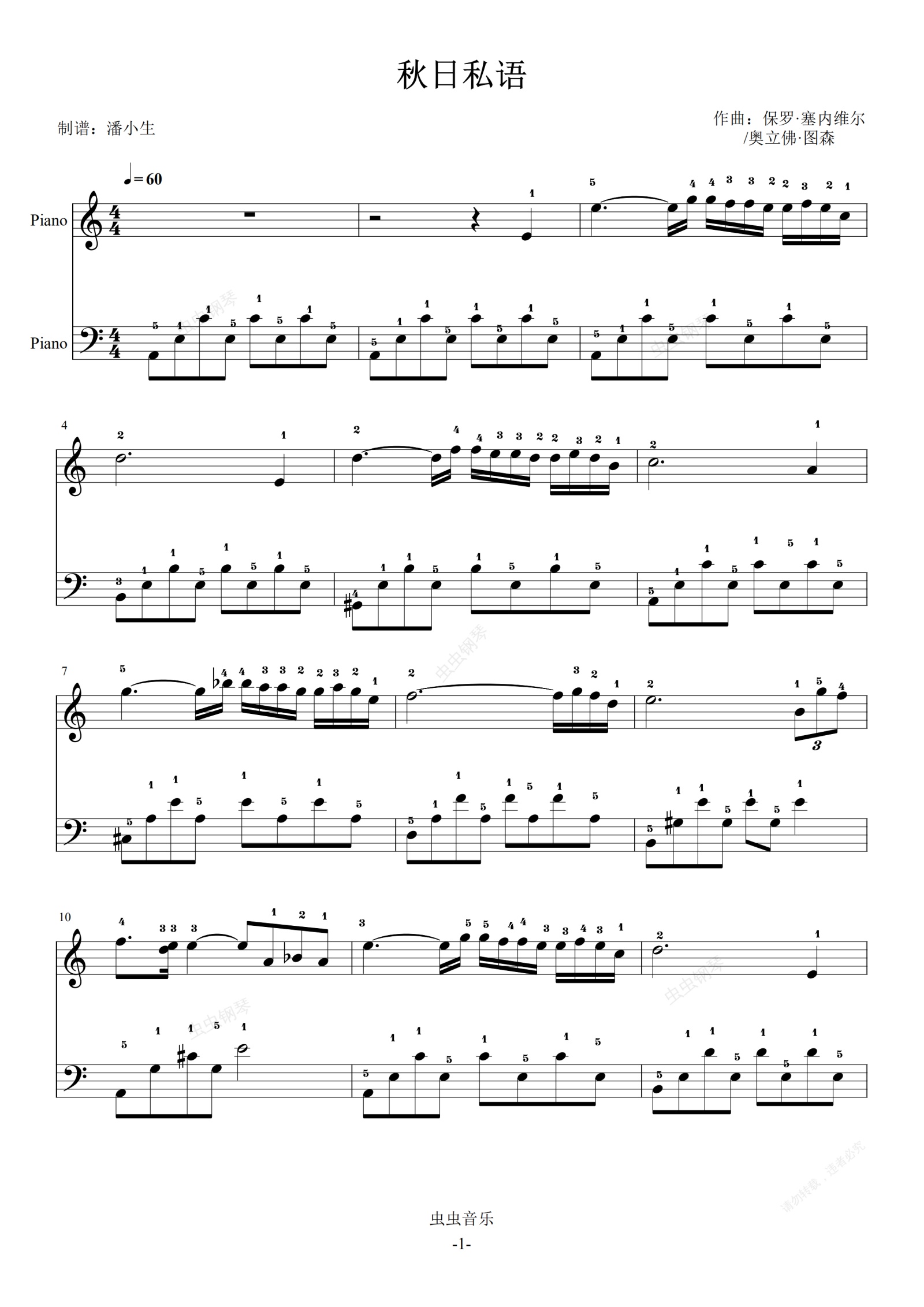 钢琴谱:秋日私语 完整指法 C调 初学者优选 简单版