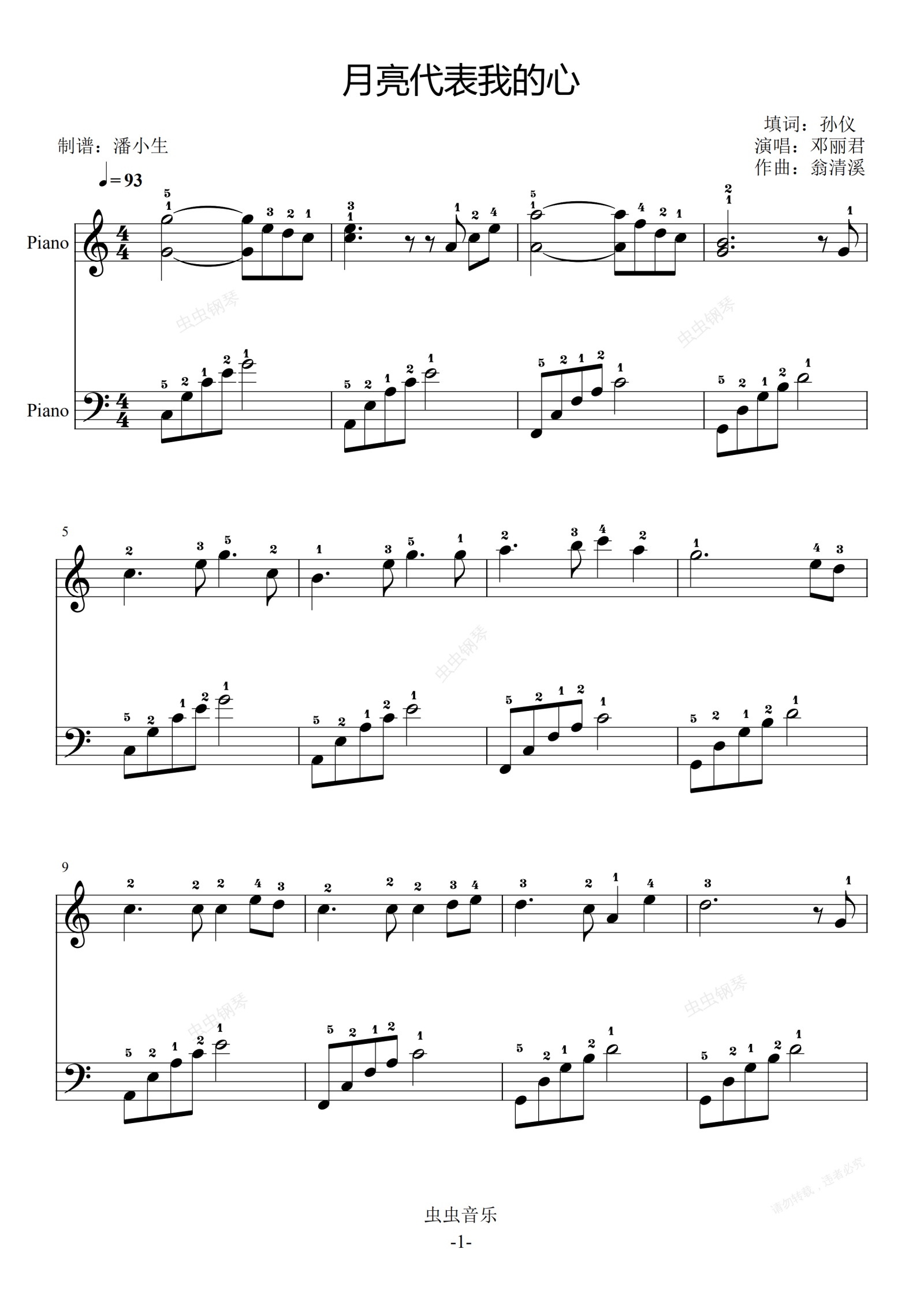 钢琴谱:月亮代表我的心 完整指法 C调 初学者优选 超简单版