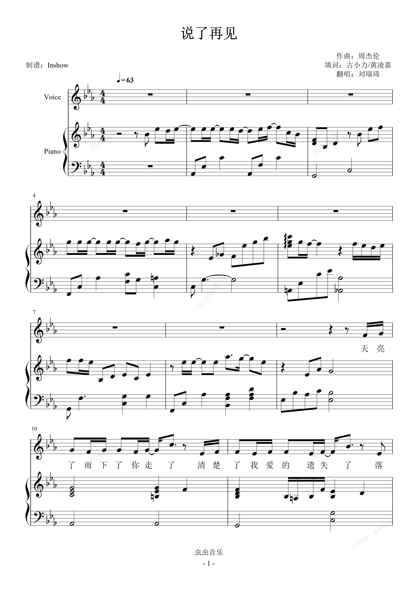 钢琴谱:刘瑞琦 - 说了再见(原唱:周杰伦)【弹唱谱】