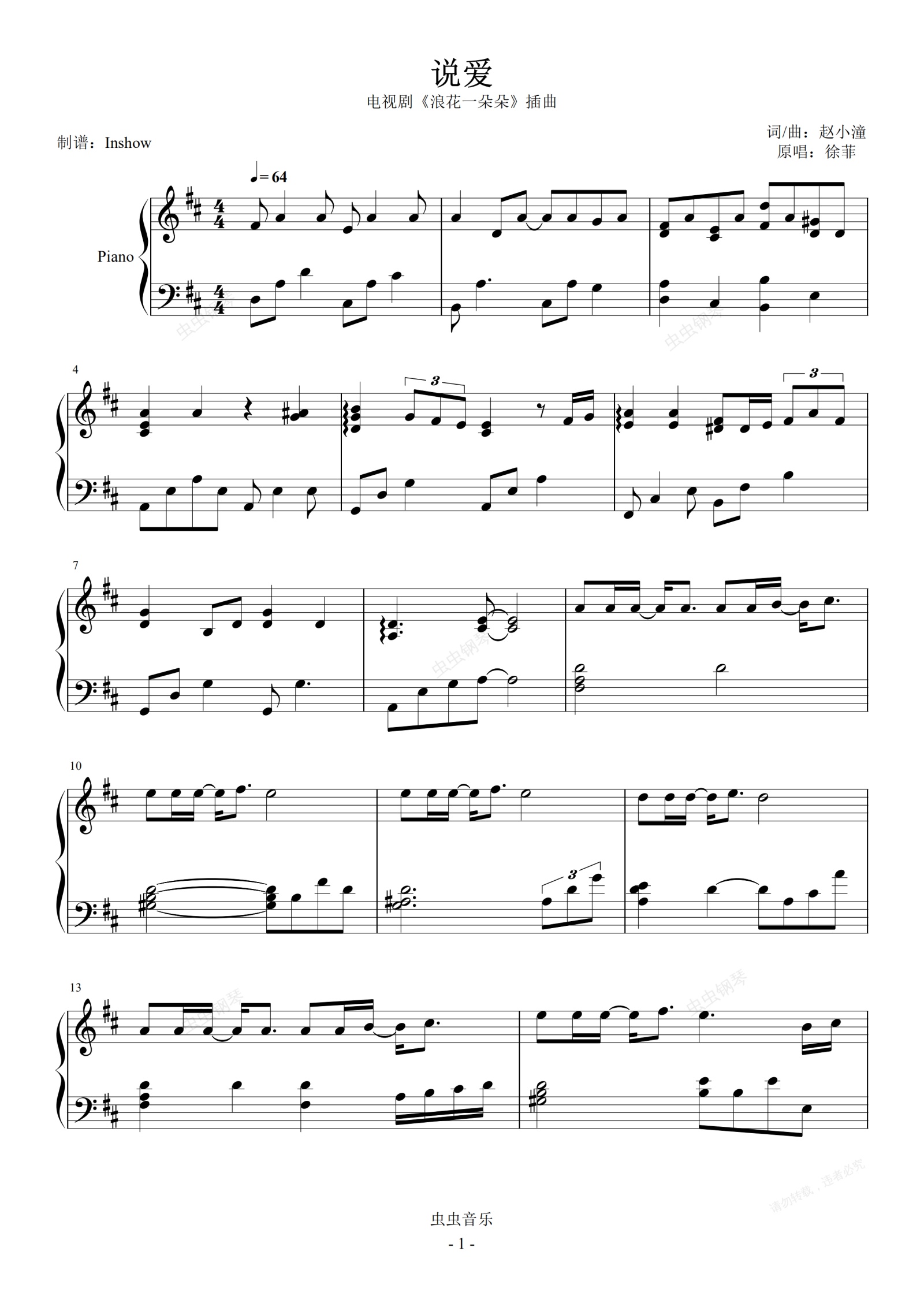 钢琴谱:徐菲 - 说爱(电视剧《浪花一朵朵》插曲)【独奏谱】