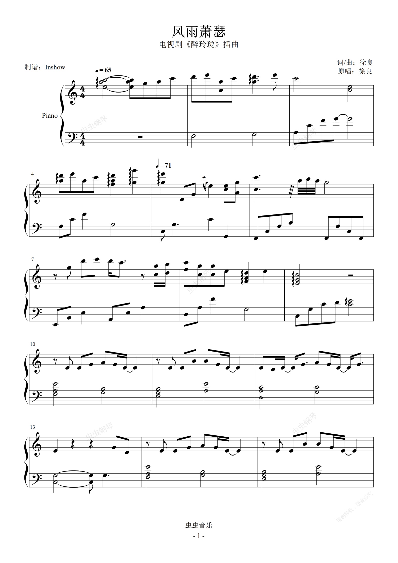钢琴谱:徐良 - 风雨萧瑟(电视剧《醉玲珑》插曲)【独奏谱】