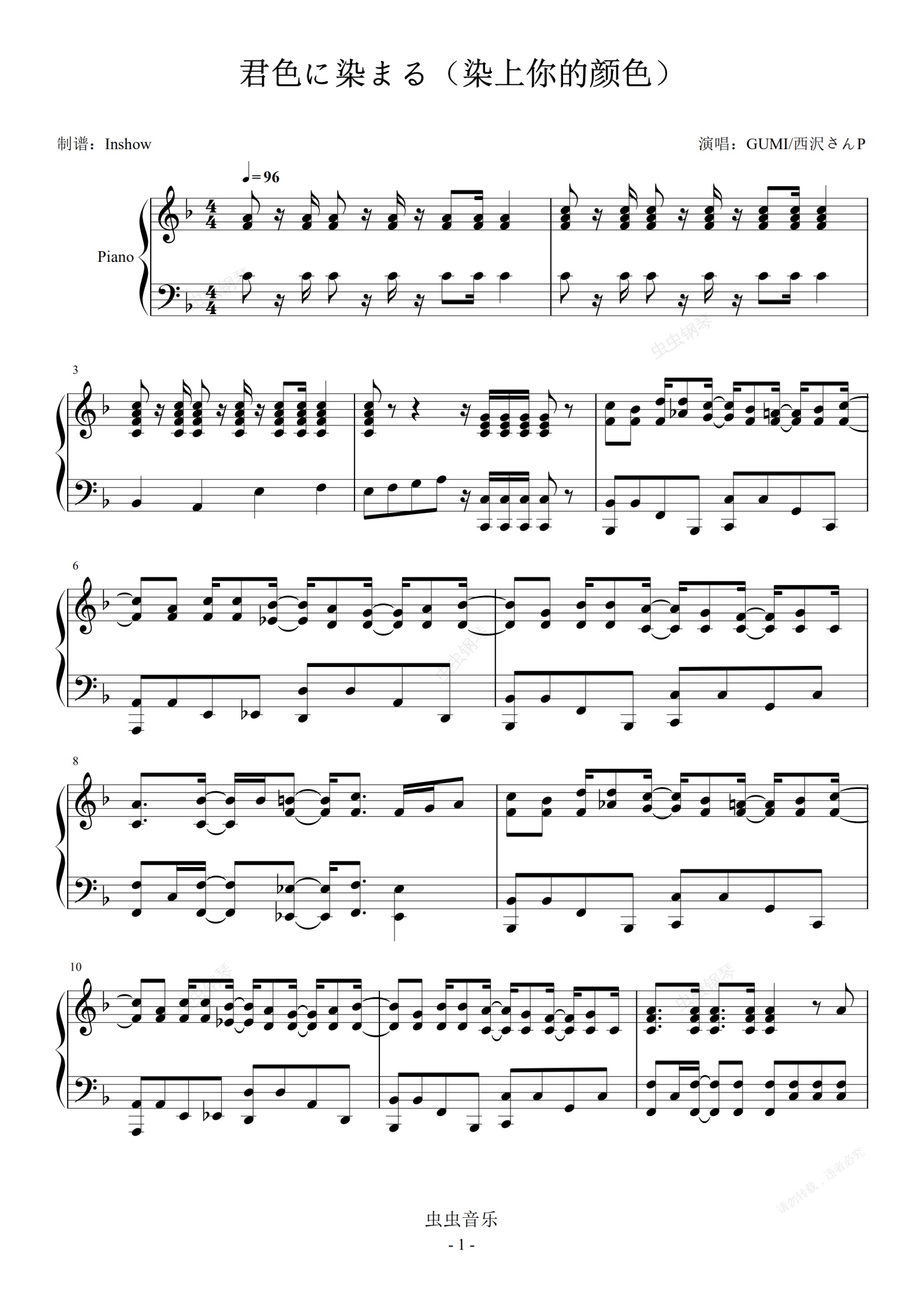 钢琴谱:GUMI - 君色に染まる(染上你的颜色)【独奏谱】