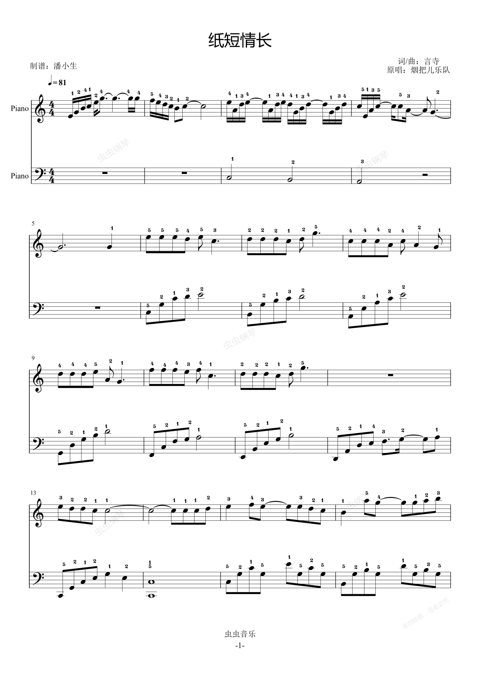 钢琴谱:纸短情长 完整指法 C调 初学者优选 简化版