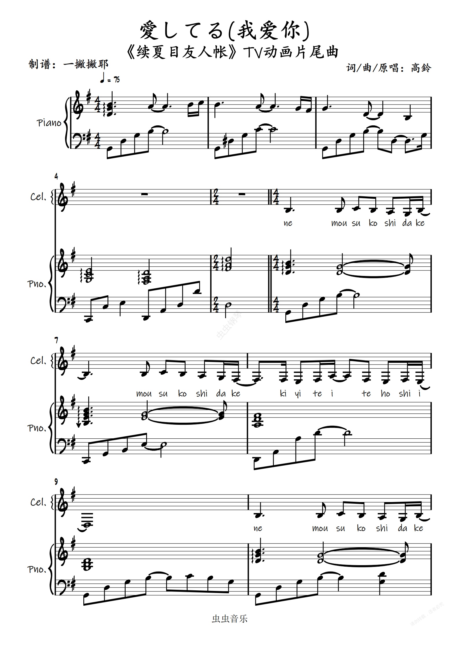 钢琴谱:愛してる(我爱你)【降调版弹唱谱(附罗马音歌词)】高铃《续夏目友人帐》「一撇撇耶」