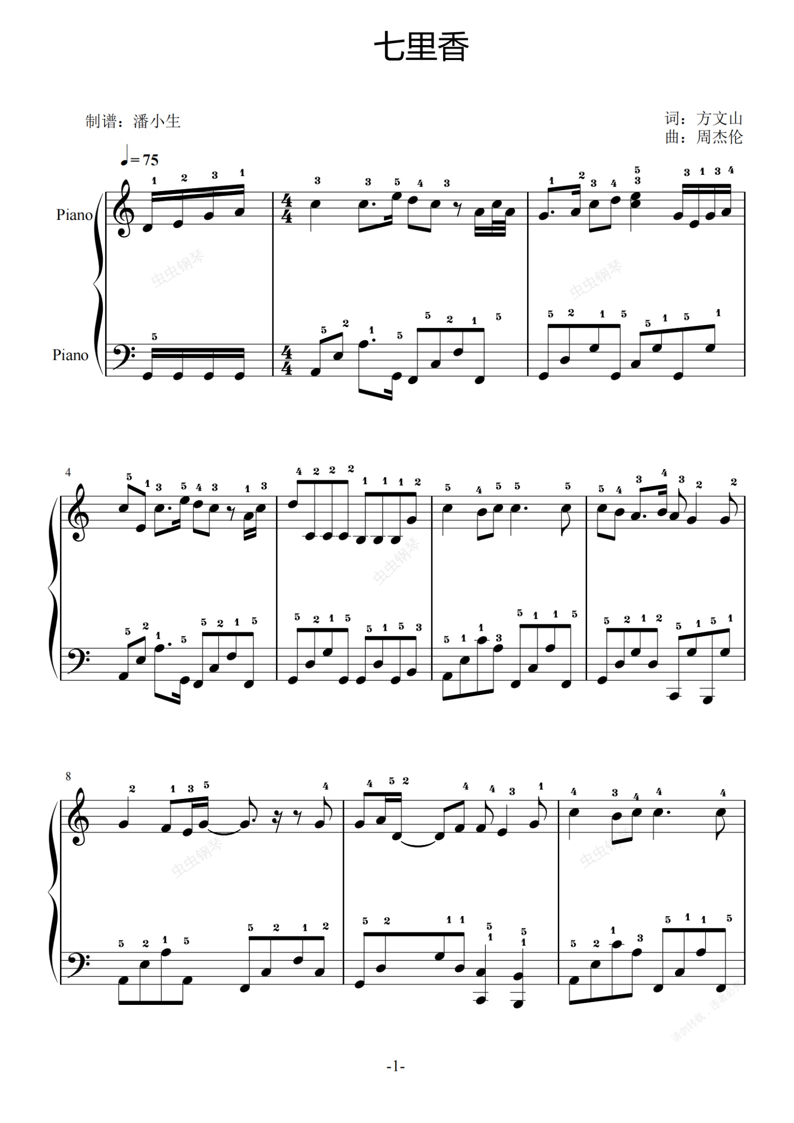钢琴谱:七里香 完整指法 C调 简易版 初学者优选