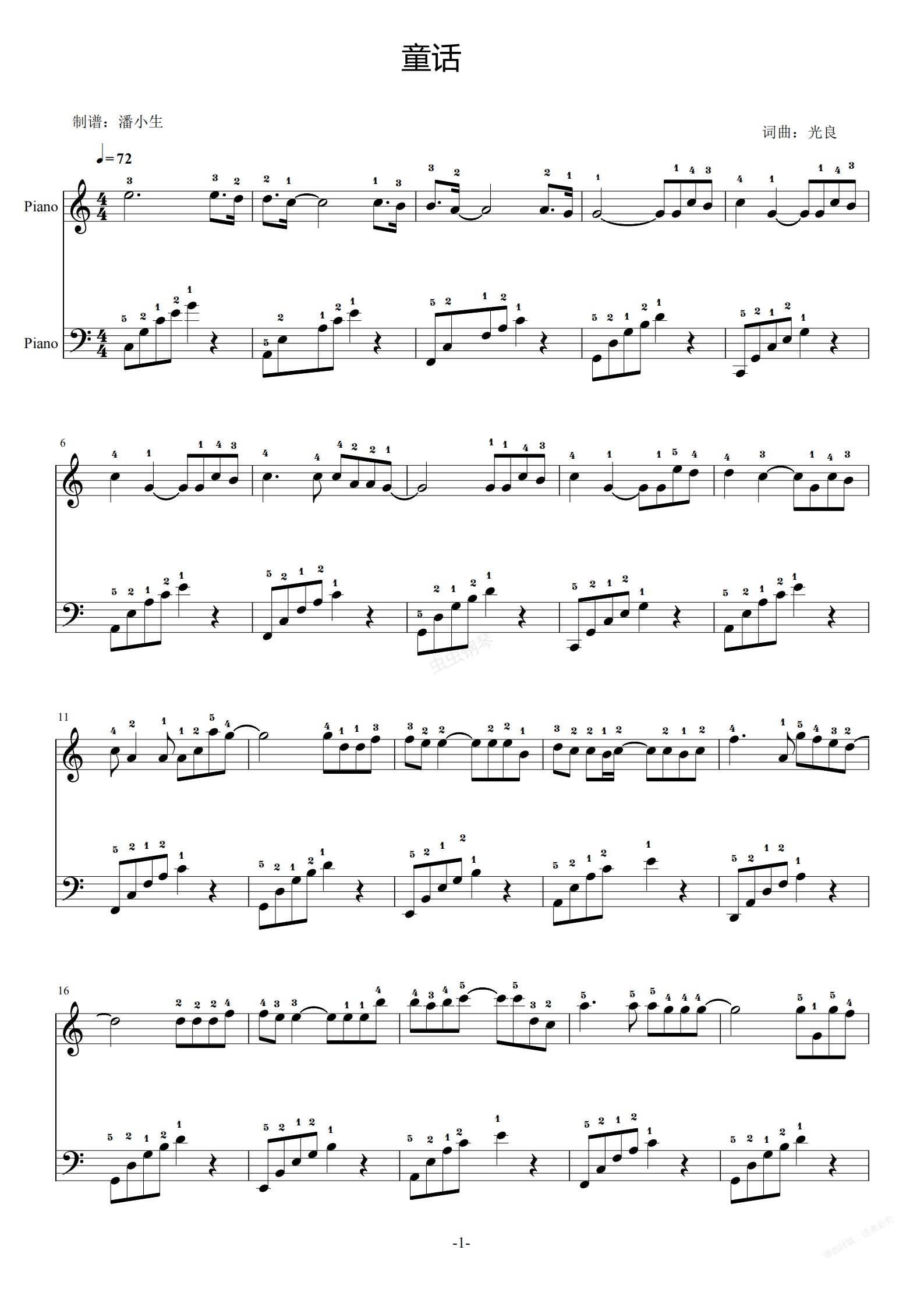 钢琴谱:童话 完整指法 C调 初学者优先 极简版