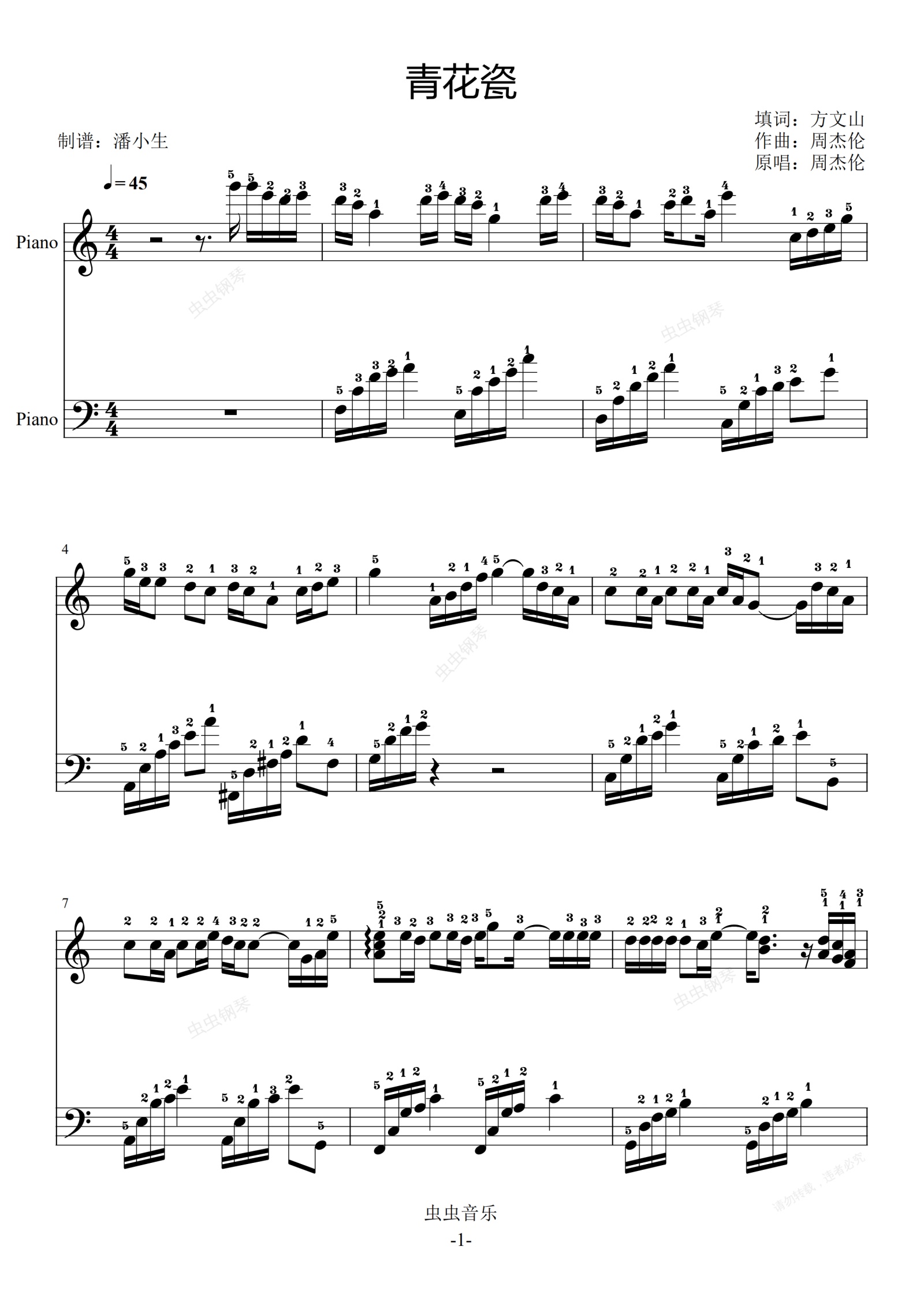 钢琴谱:青花瓷 完整指法 C调 初学者优选 简化版
