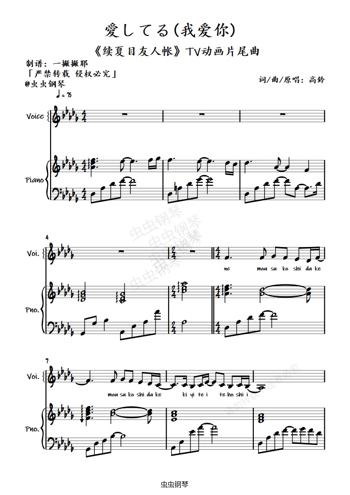 钢琴谱:愛してる 我爱你「弹唱谱」高铃《续夏目友人帐》ED「一撇撇耶」