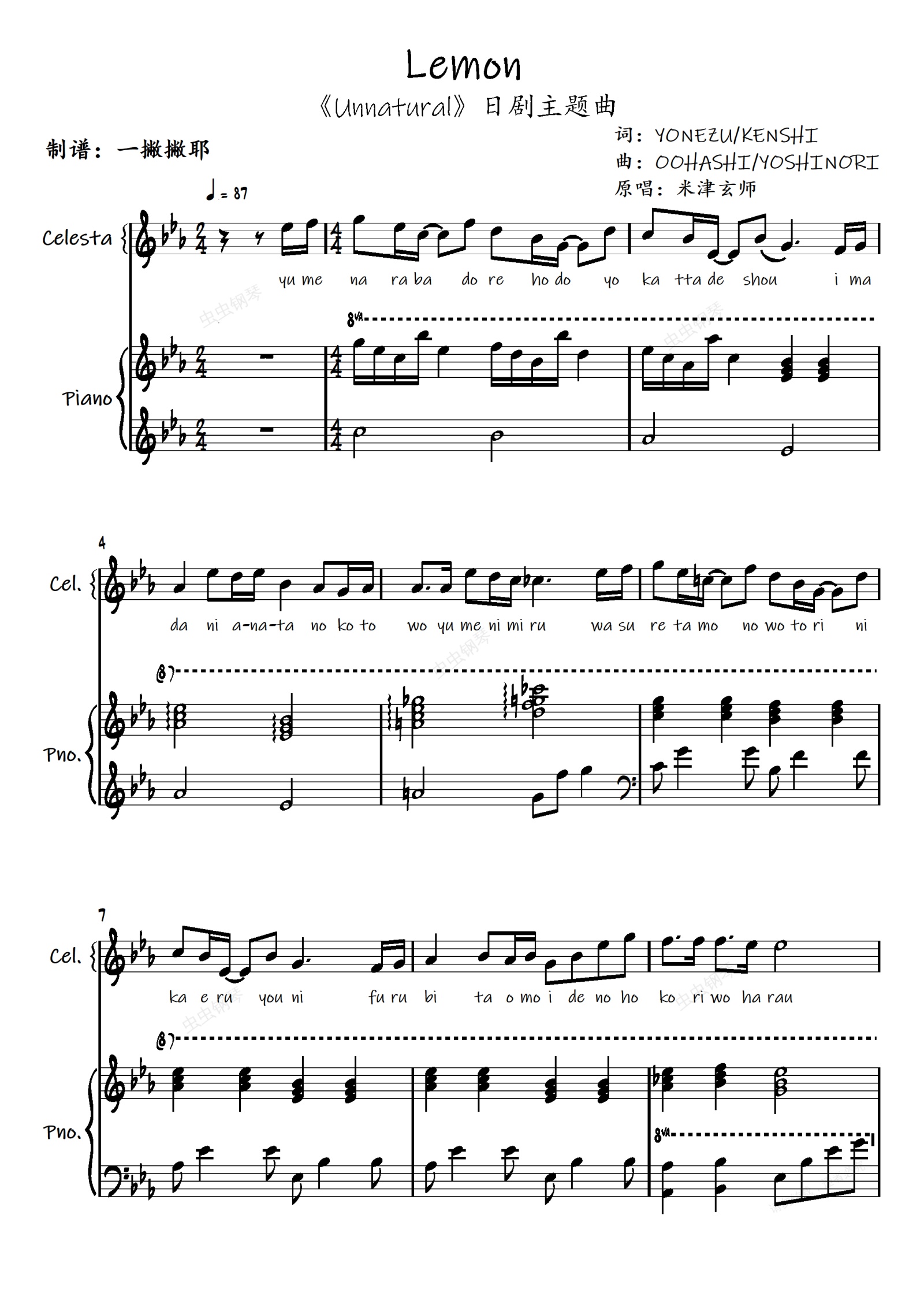 钢琴谱:Lemon【女版唯美弹唱】米津玄师《非自然死亡》「一撇撇耶」