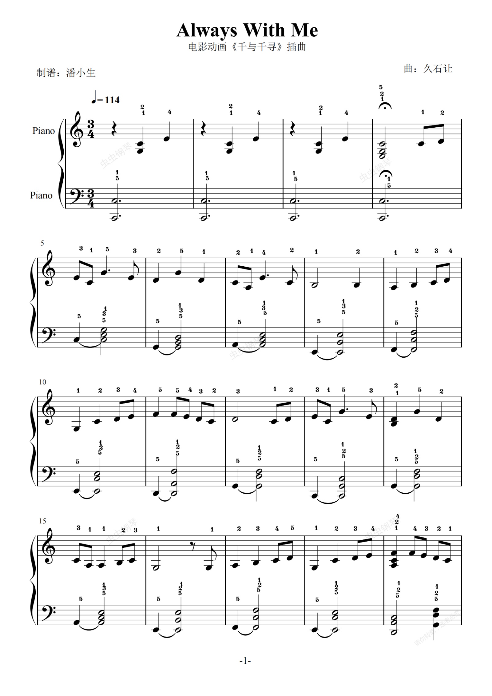 钢琴谱:Always With Me《千与千寻》 完整指法 C调 简易版 初学者优选 永远同在 亲爱的旅人啊