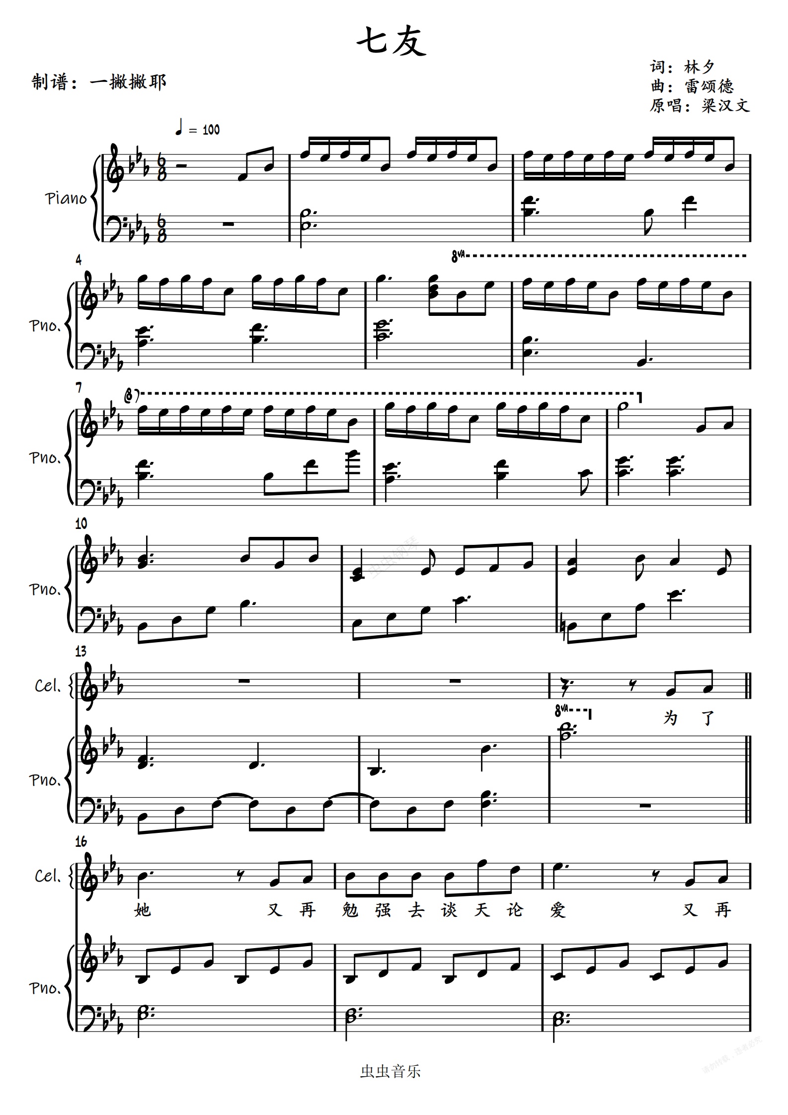 钢琴谱:七友【升调版弹唱谱】梁汉文「一撇撇耶」