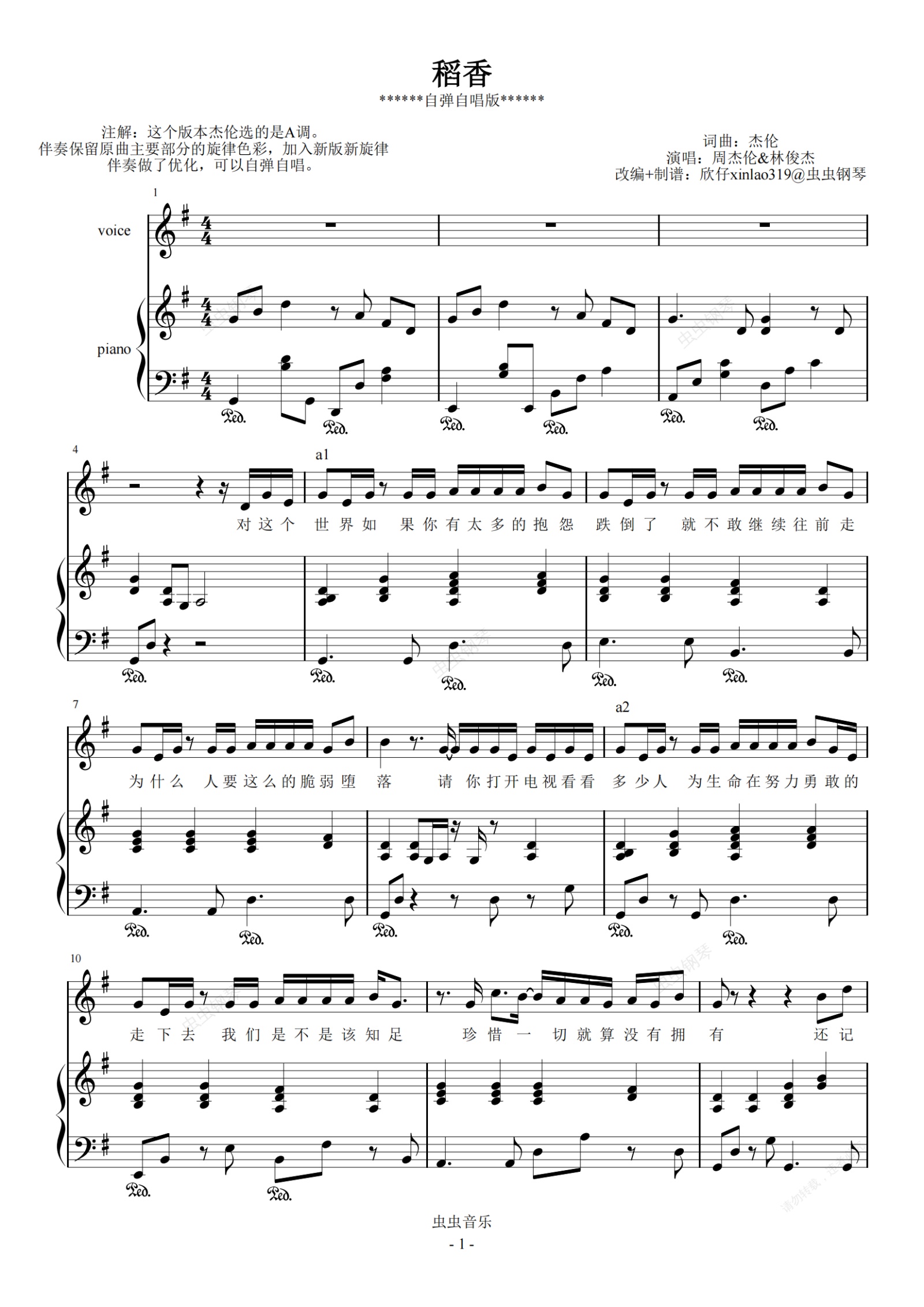 钢琴谱:稻香双J版(G调-可自弹自唱版)