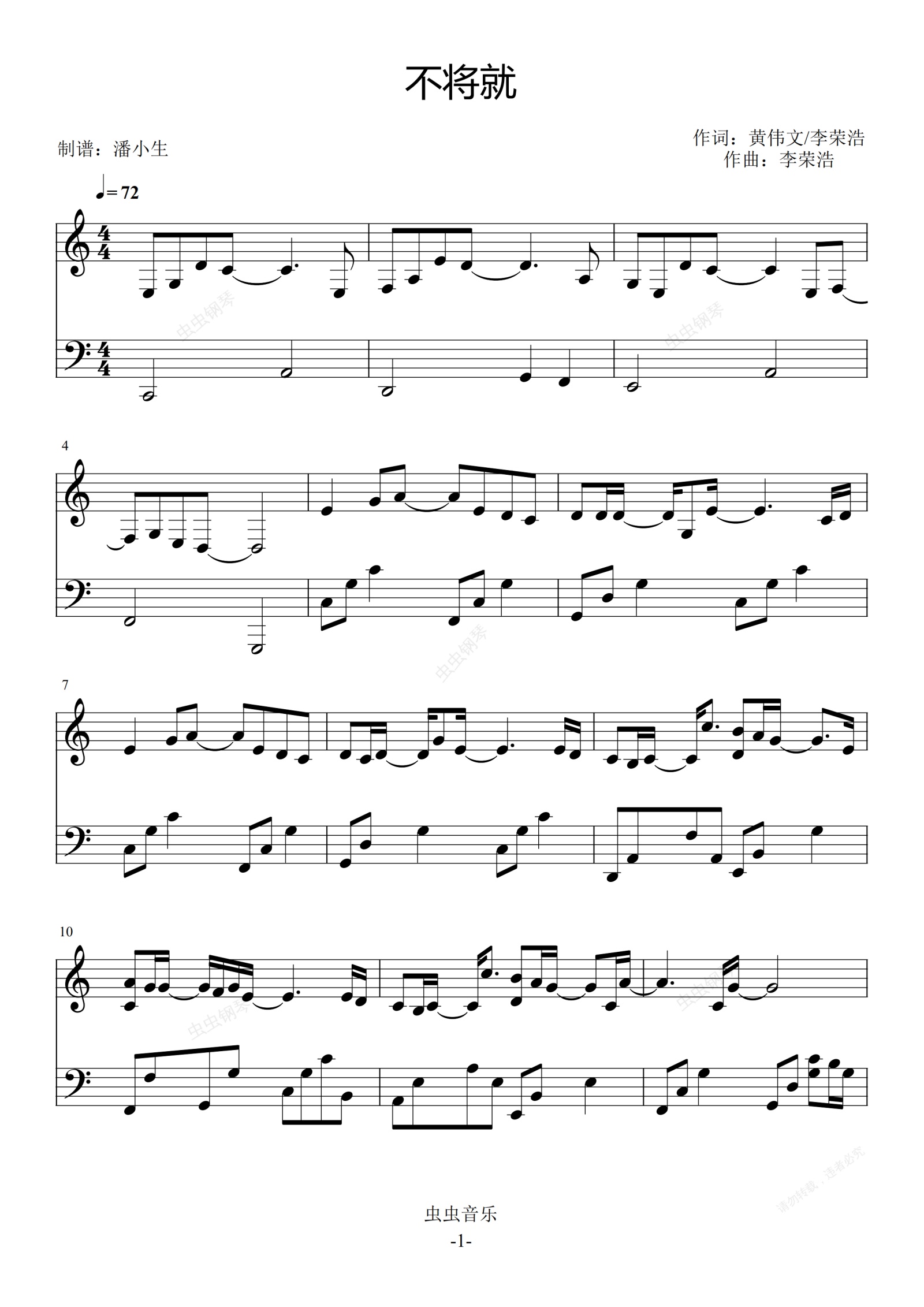 钢琴谱:不将就 原调 独奏版