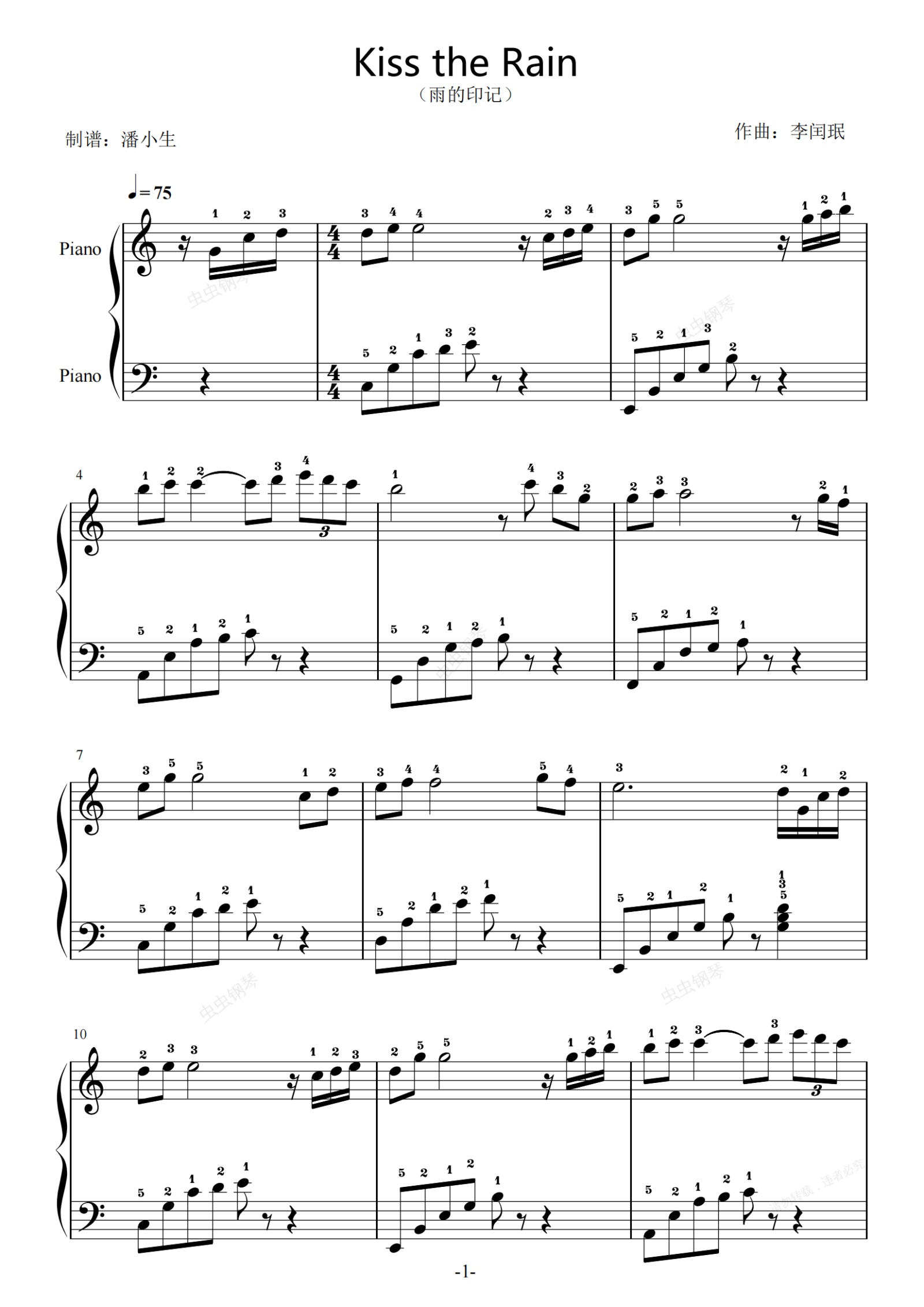 钢琴谱:雨的印记 完整指法 C调 简化版 初学者优选 Kiss The Rain