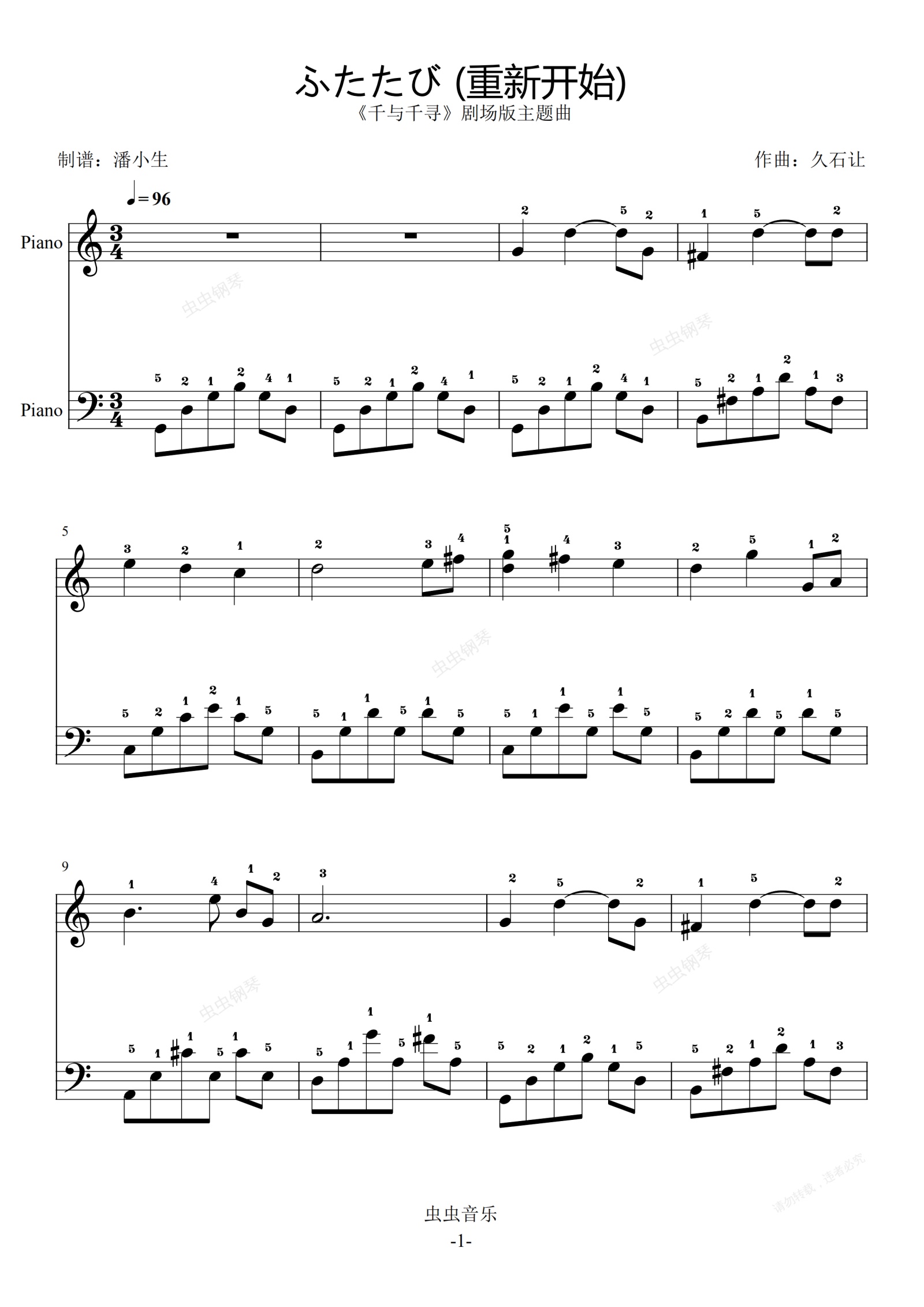 钢琴谱:重新开始 完整指法 C调 简易版 restart 千与千寻插曲