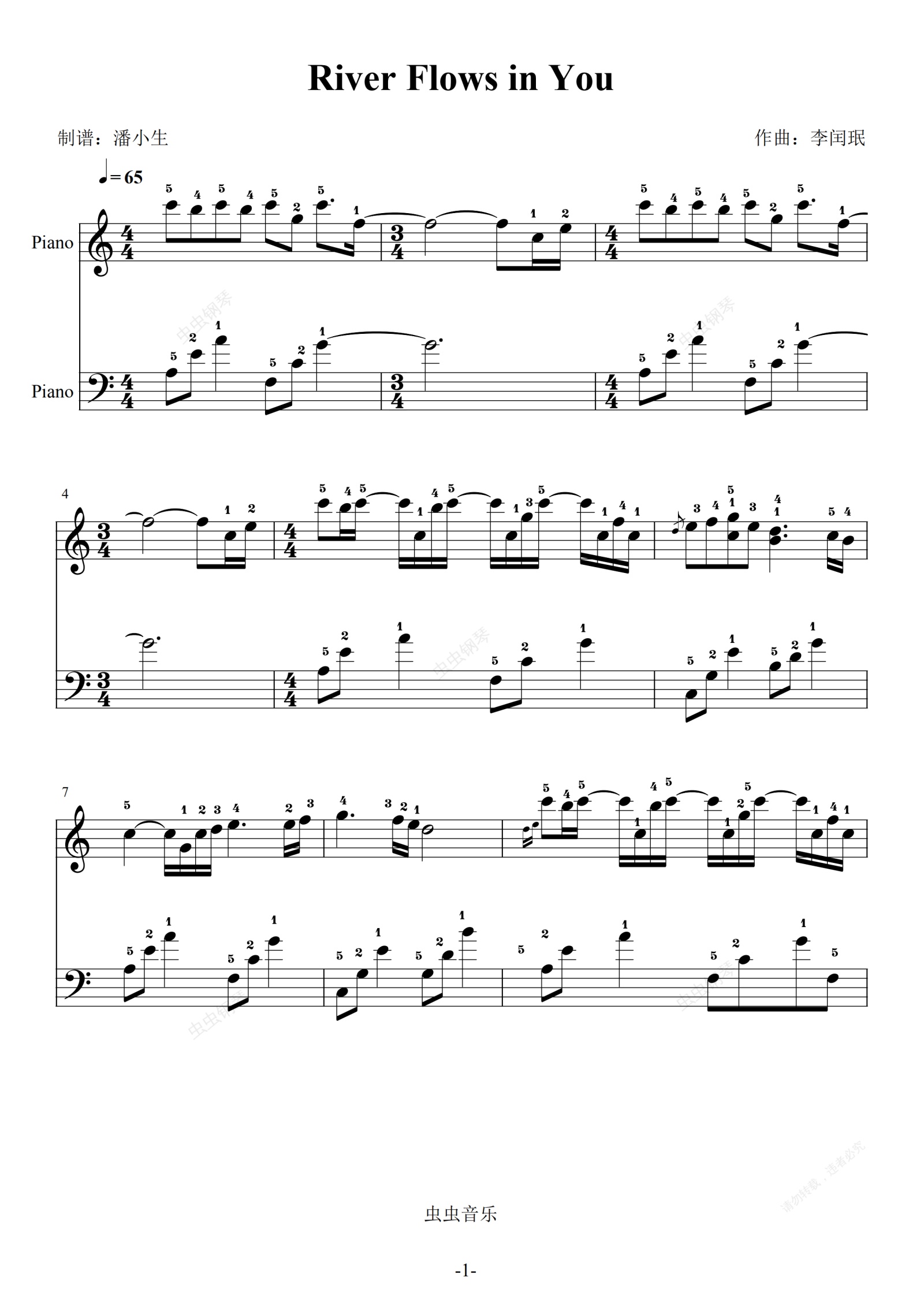 钢琴谱:River Flows In You 你的心河 完整指法 C调 初学者优选 简化版