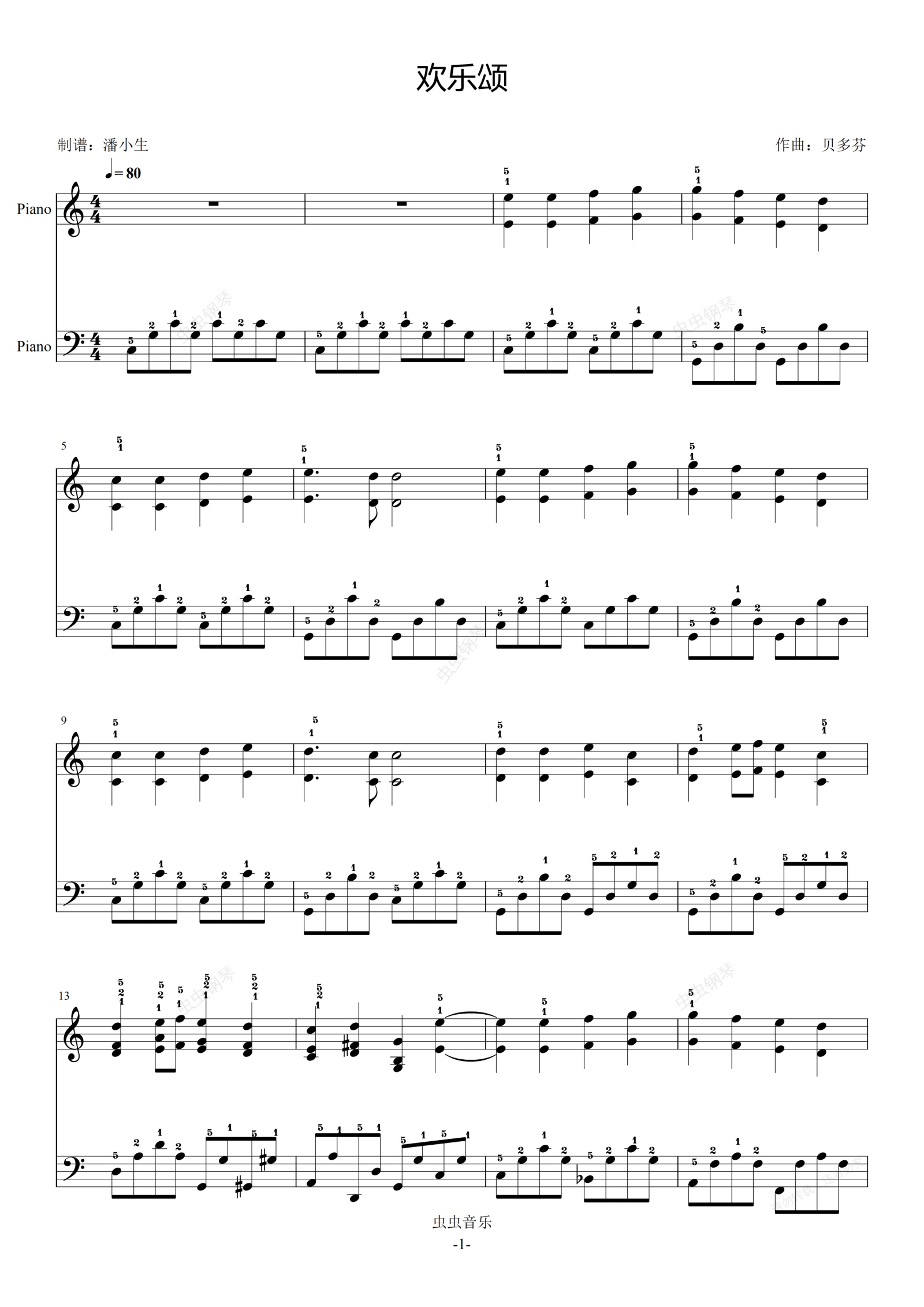 钢琴谱:欢乐颂 完整指法 C调 初学者优选 贝多芬 简化版