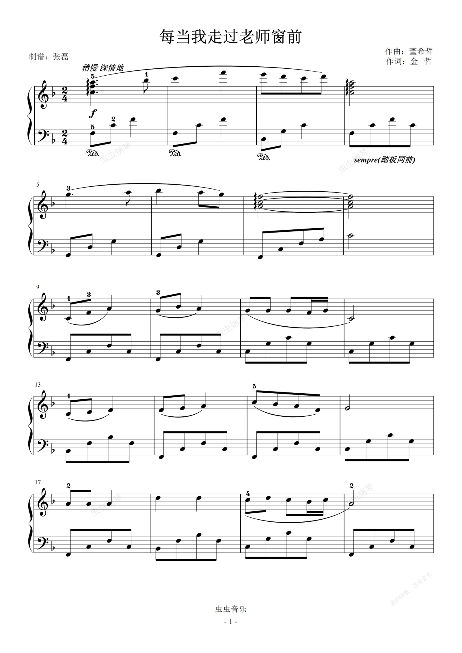 钢琴谱:每当我走过老师窗前--童声合唱--F大调