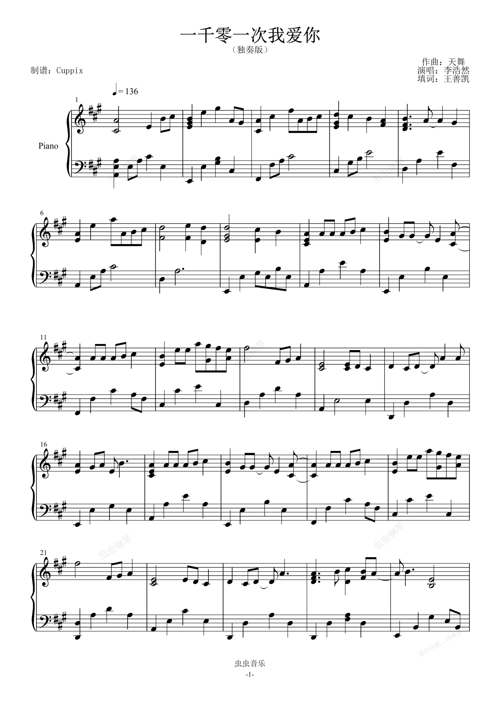 钢琴谱:李浩然《一千零一次我爱你》钢琴独奏版