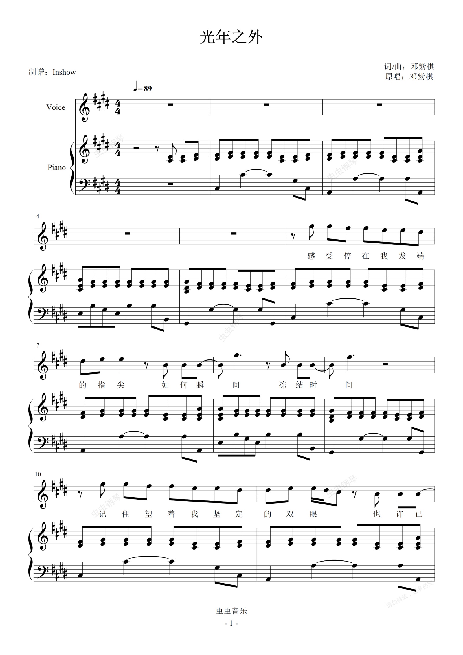 钢琴谱:G.E.M.邓紫棋 - 光年之外【弹唱谱】