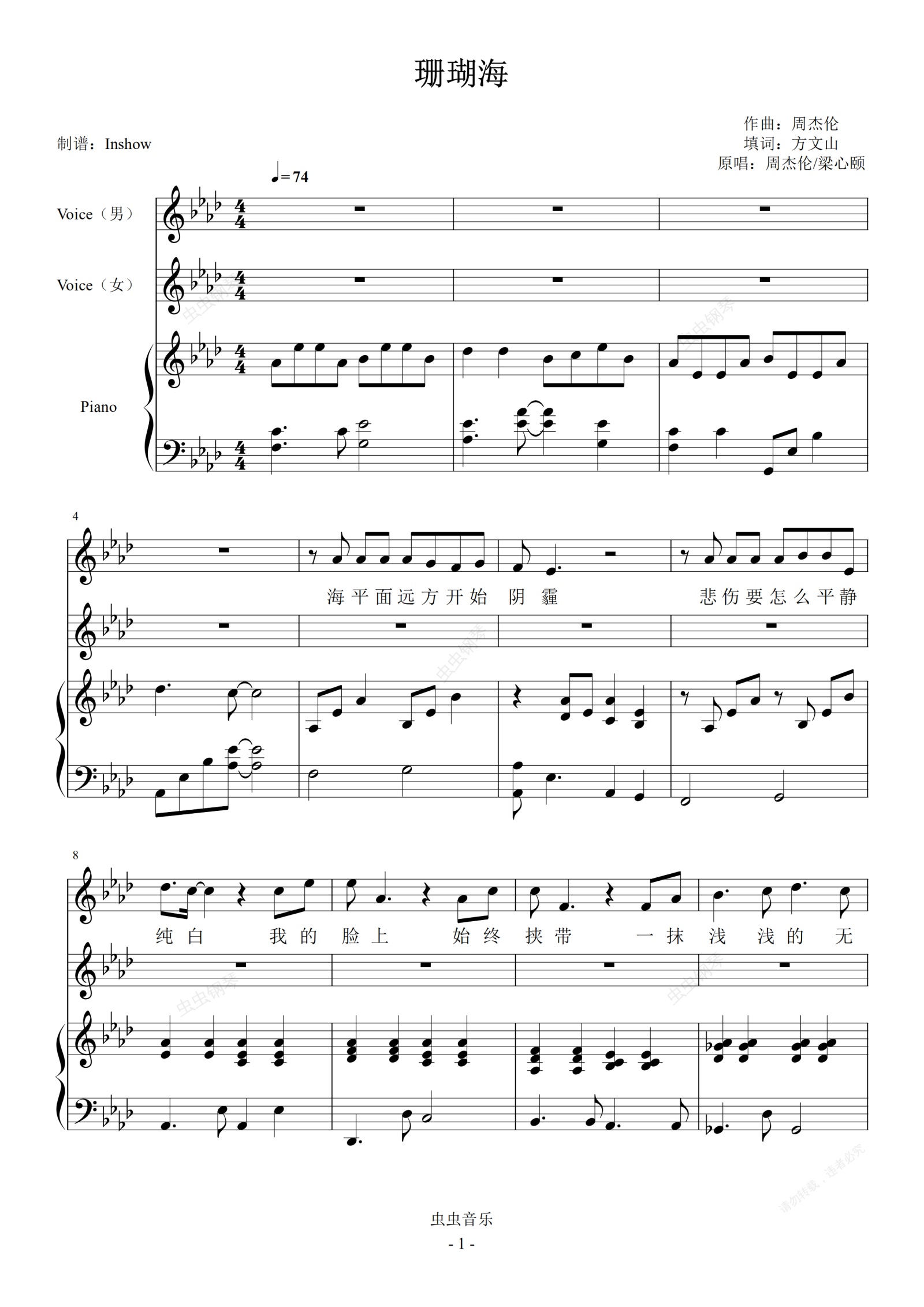 钢琴谱:周杰伦、梁心颐 - 珊瑚海【弹唱谱】