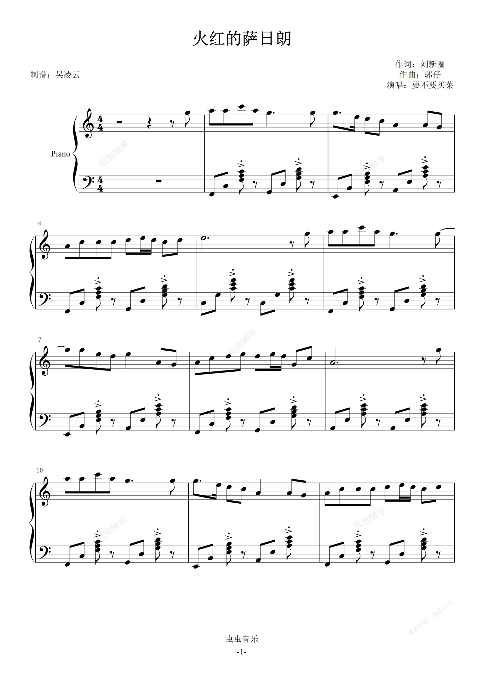 钢琴谱:火红的萨日朗 要不要买菜 吴凌云钢琴编配活跃钢琴版