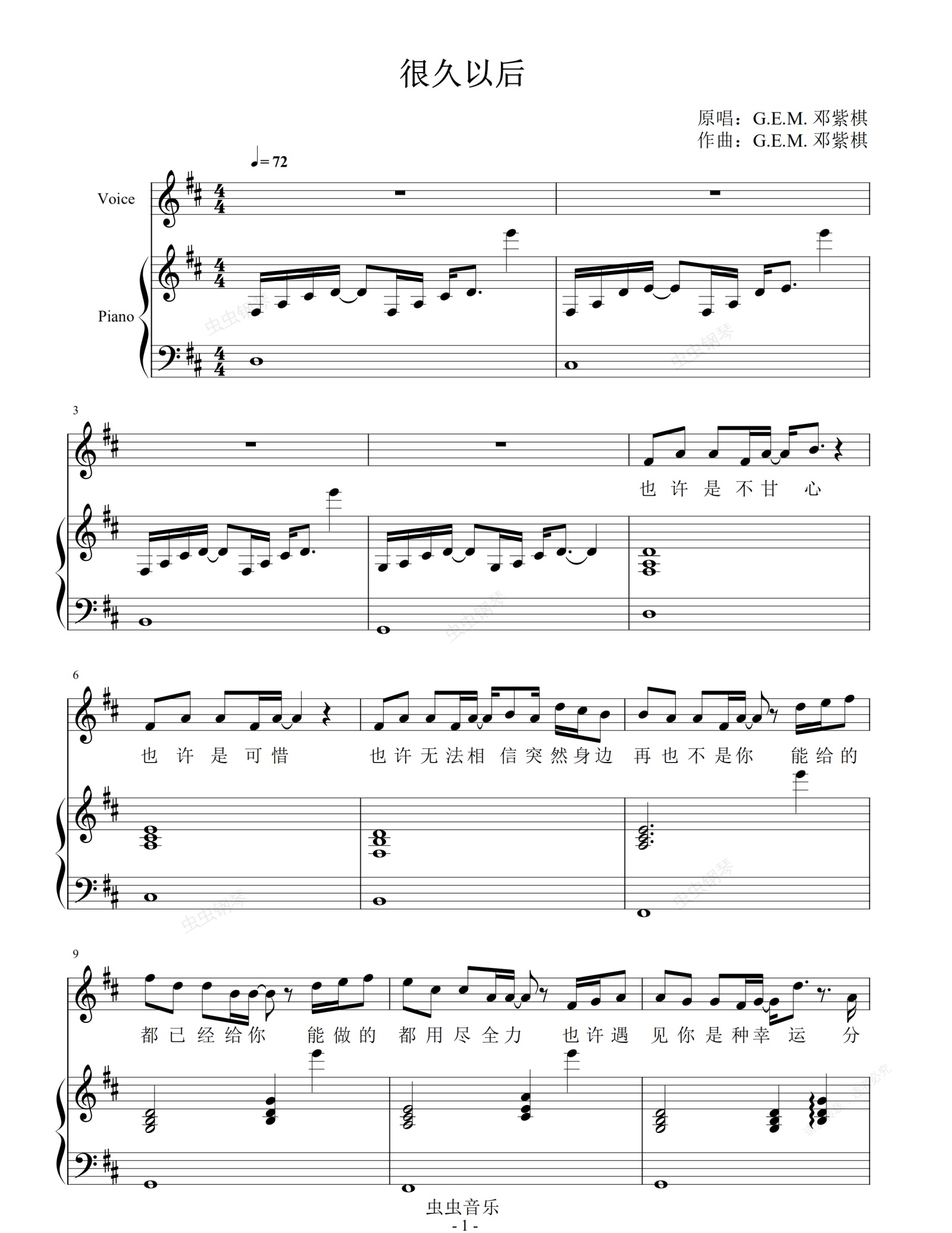 钢琴谱:G.E.M. 邓紫棋 - 很久以后【弹唱谱】