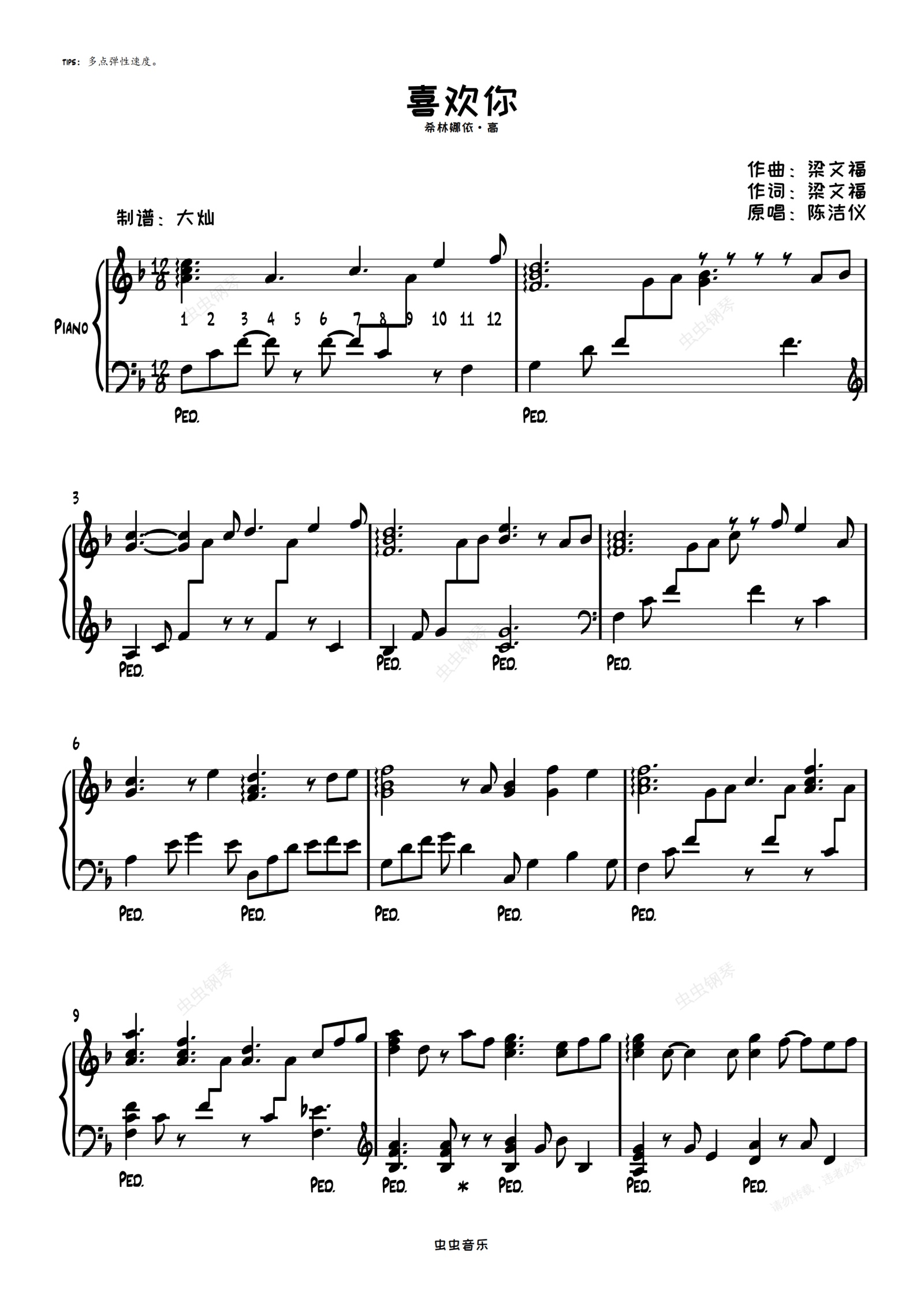 钢琴谱:《喜欢你》 - 希林娜依·高   演奏版(大灿)