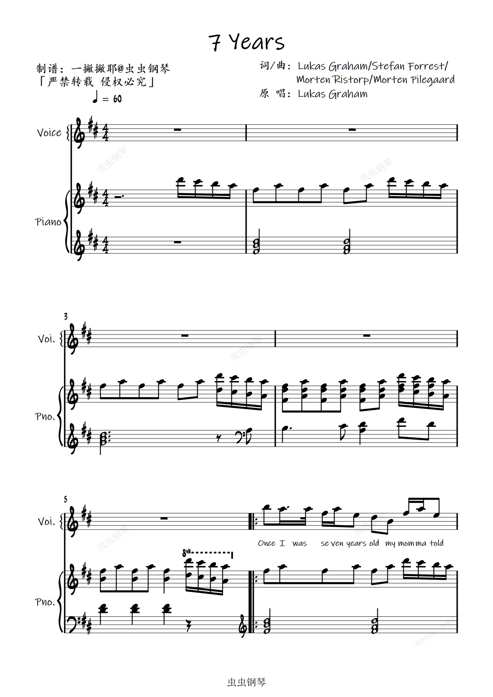 钢琴谱:7 Years【弹唱谱】Lukas Graham「一撇撇耶」