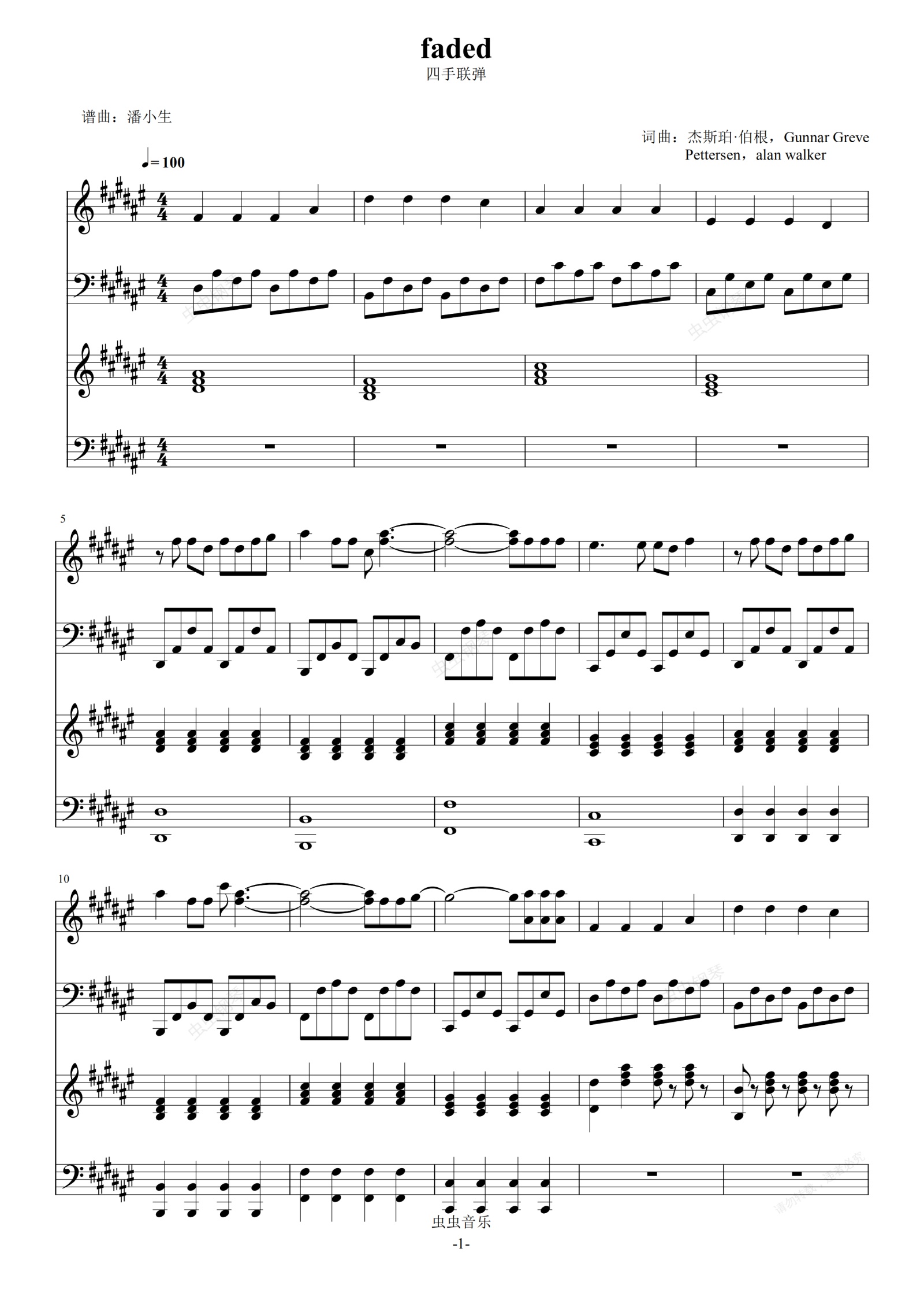 钢琴谱:faded 四手联弹 Alan Walker 原调