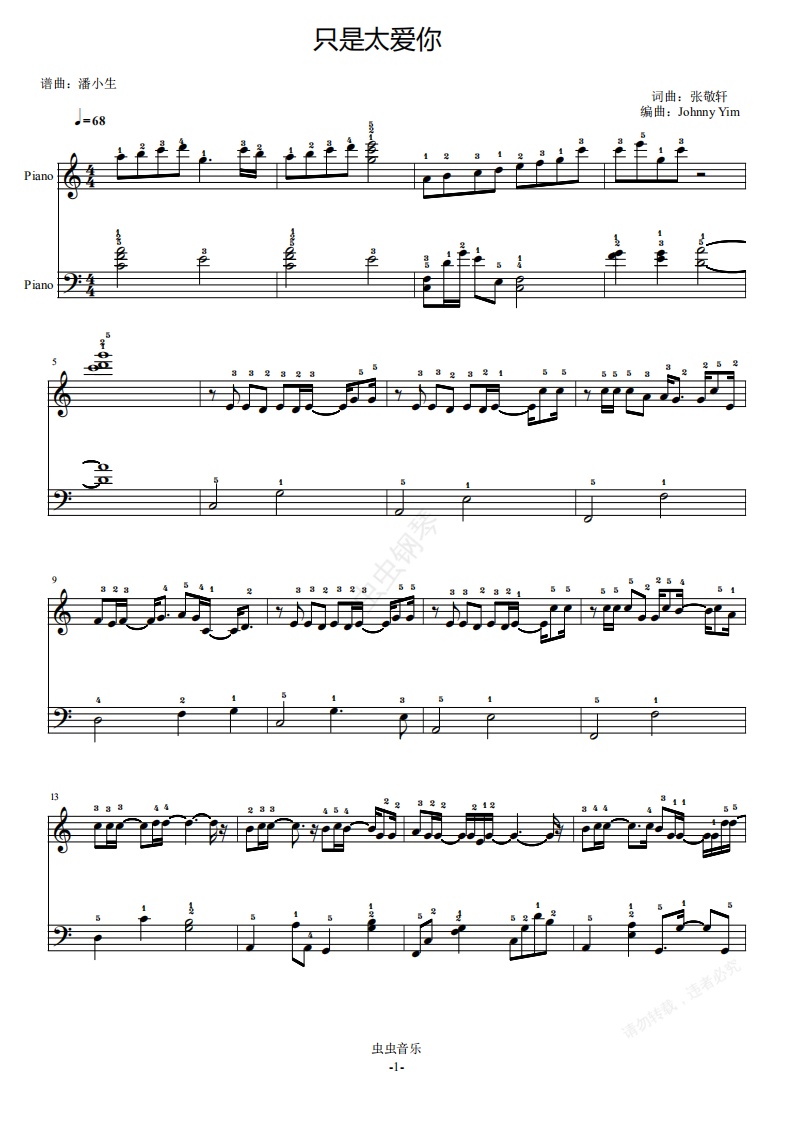 钢琴谱:只是太爱你 完整指法 C调 初学者优选 简化版