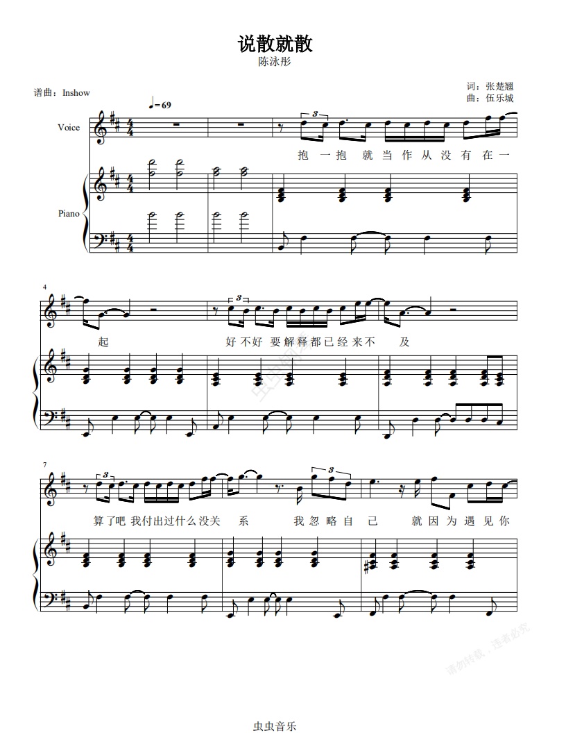 钢琴谱:陈泳彤 - 说散就散【弹唱谱】