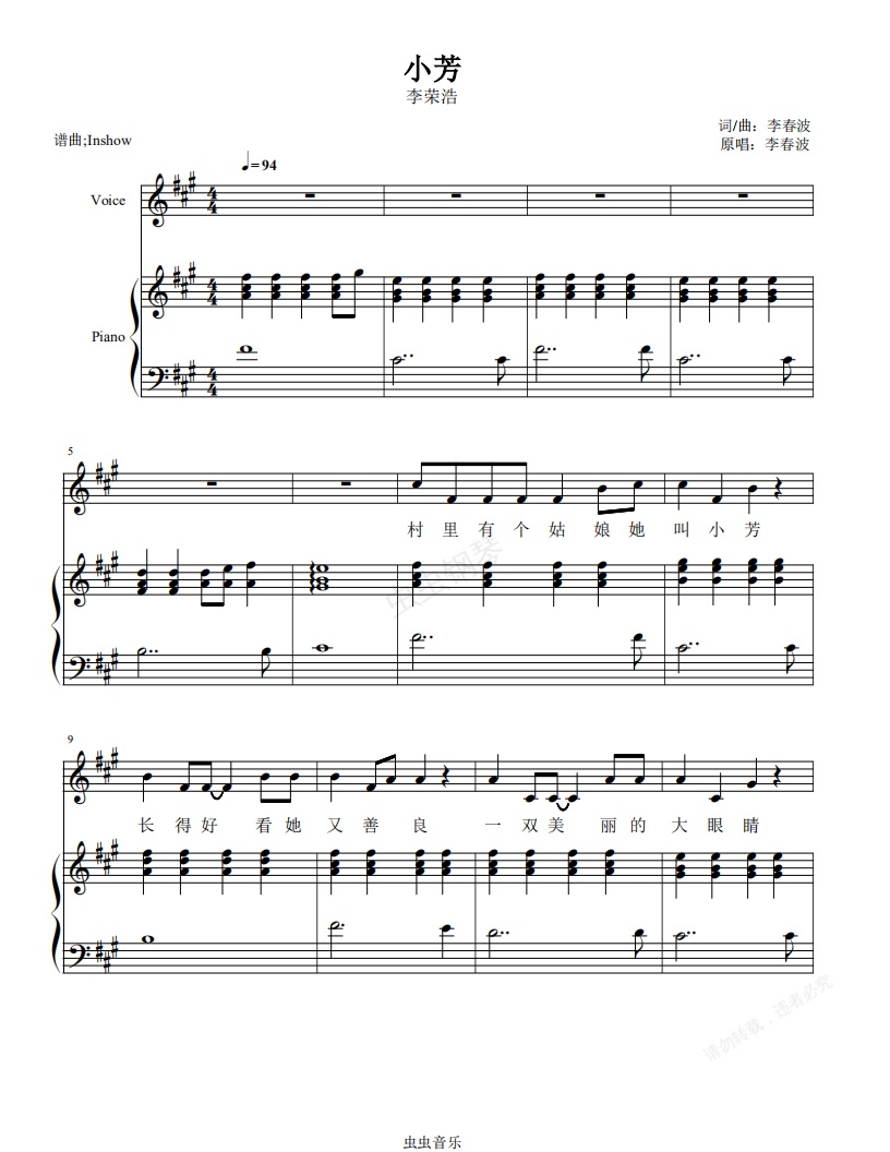 钢琴谱:李荣浩 - 小芳(Live)【弹唱谱】