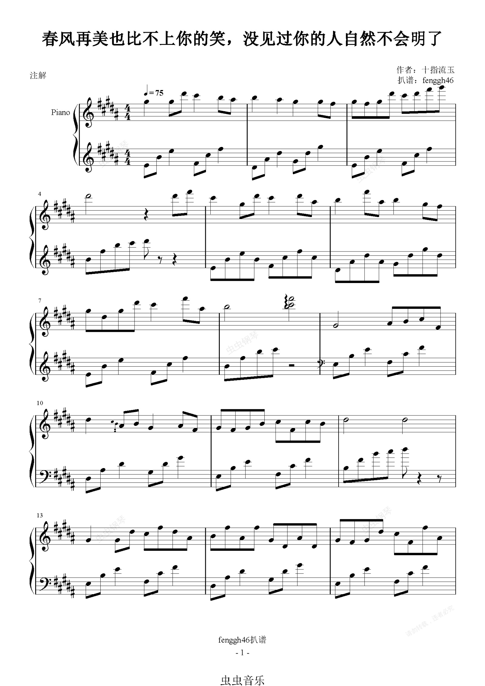 钢琴谱:春风再美也比不上你的笑,没见过你的人自然不会明了-钢琴