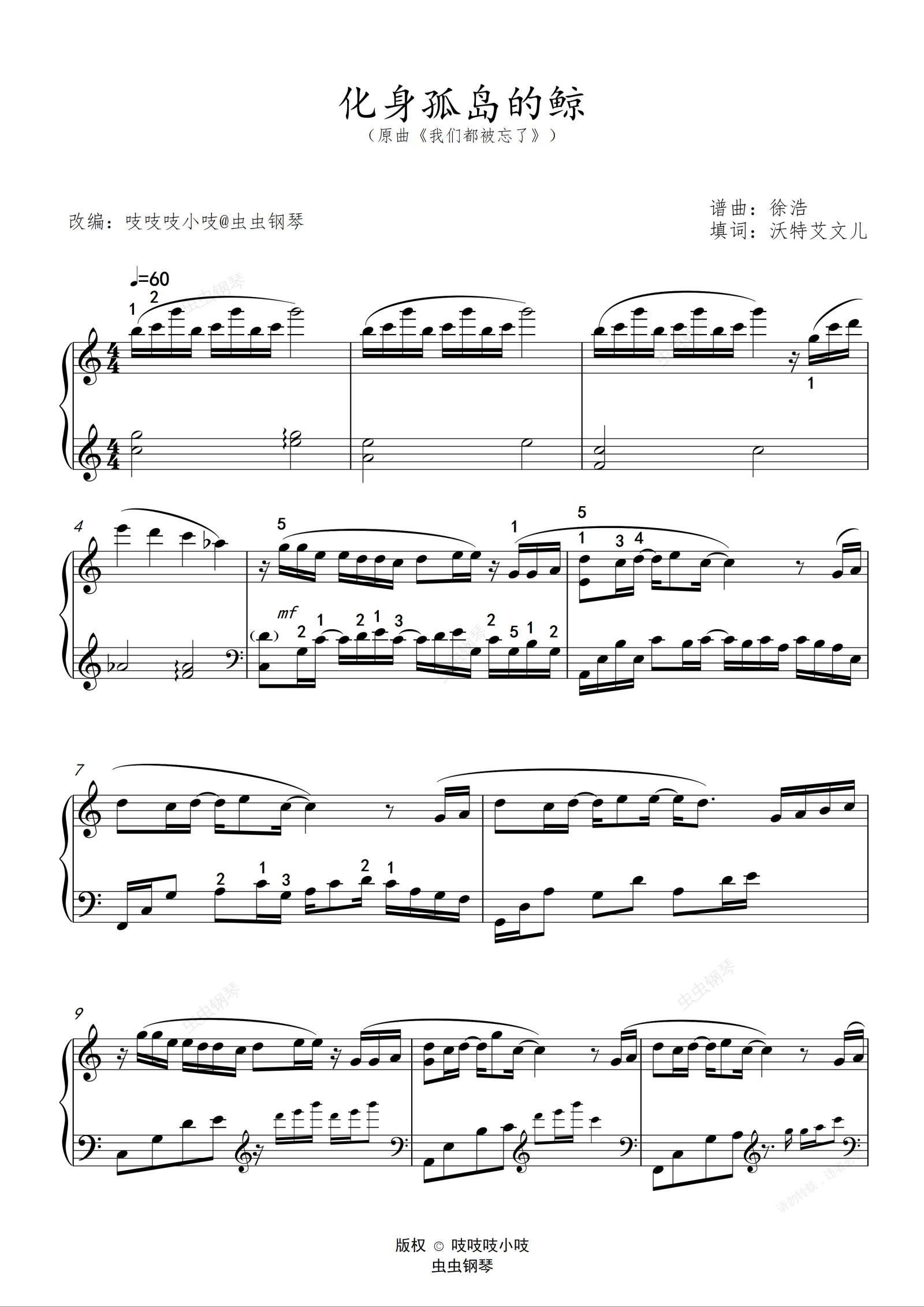 钢琴谱:化身孤岛的鲸(完整版)(原曲《我们都被忘了》)