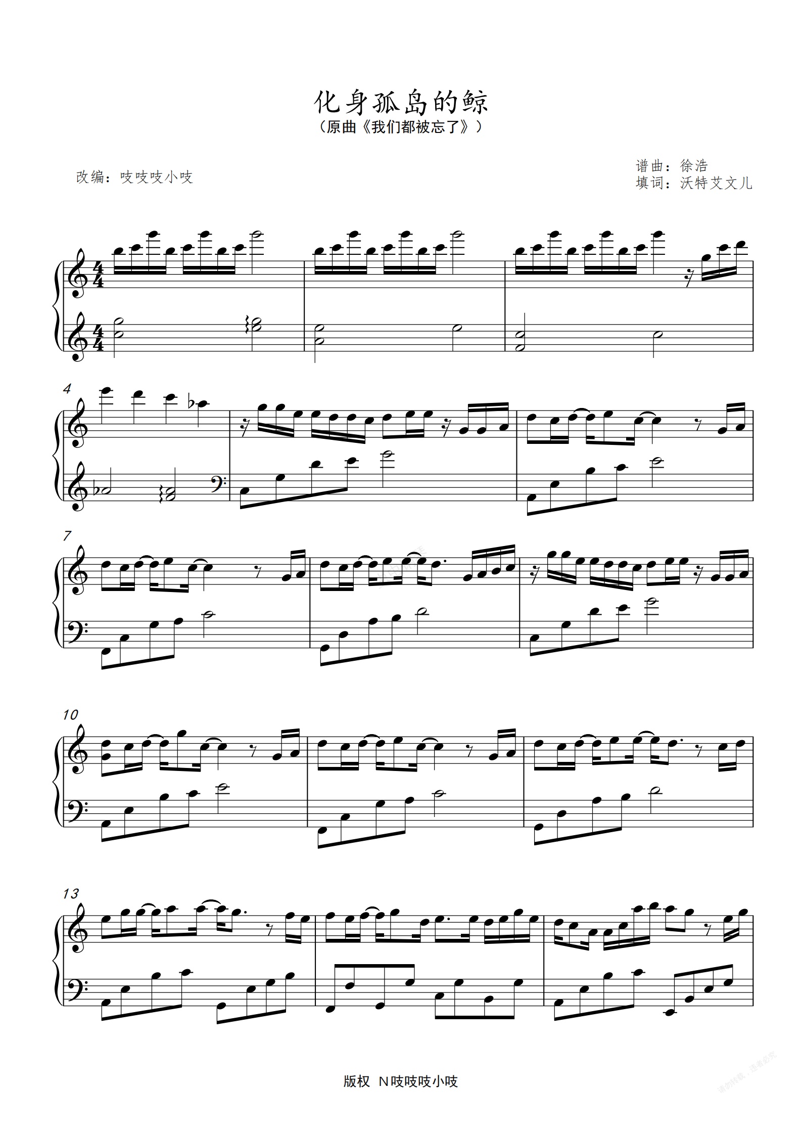 钢琴谱:化身孤岛的鲸(简易版)(原曲《我们都被忘了》)