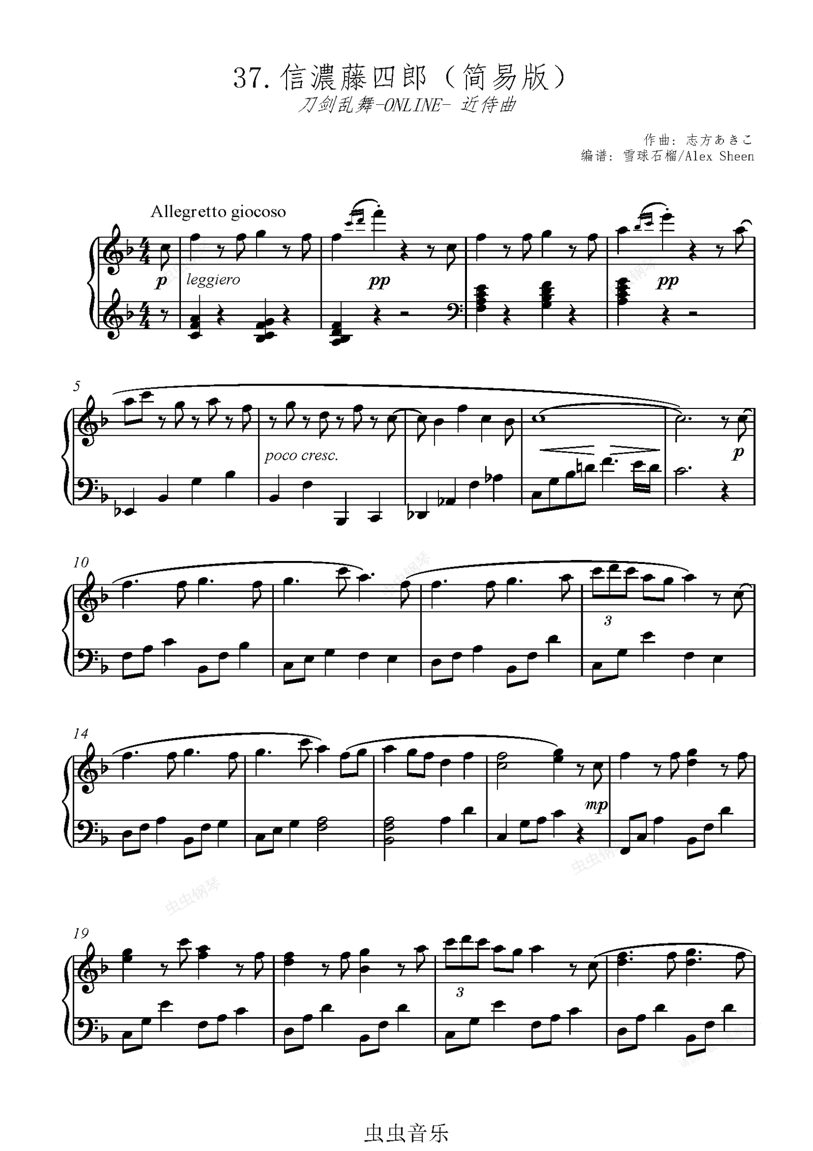 钢琴谱:信浓藤四郎 近侍曲 【刀剑乱舞】(简易版)