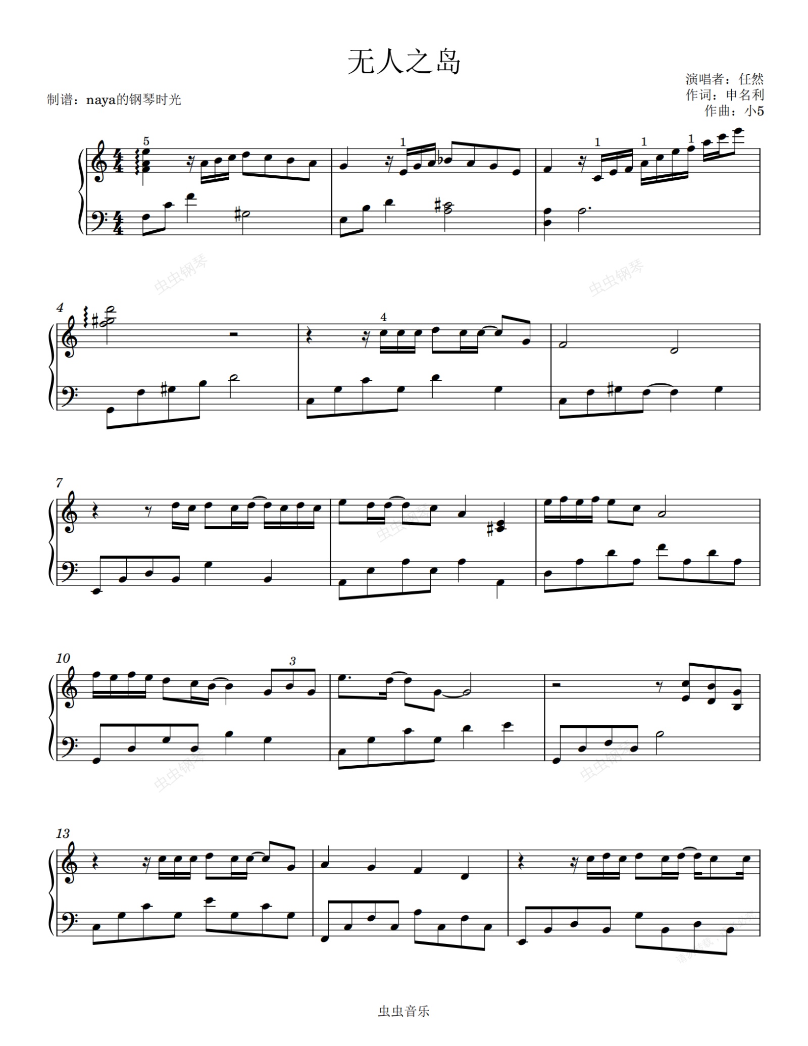 钢琴谱:无人之岛-任然-C调简易抒情版