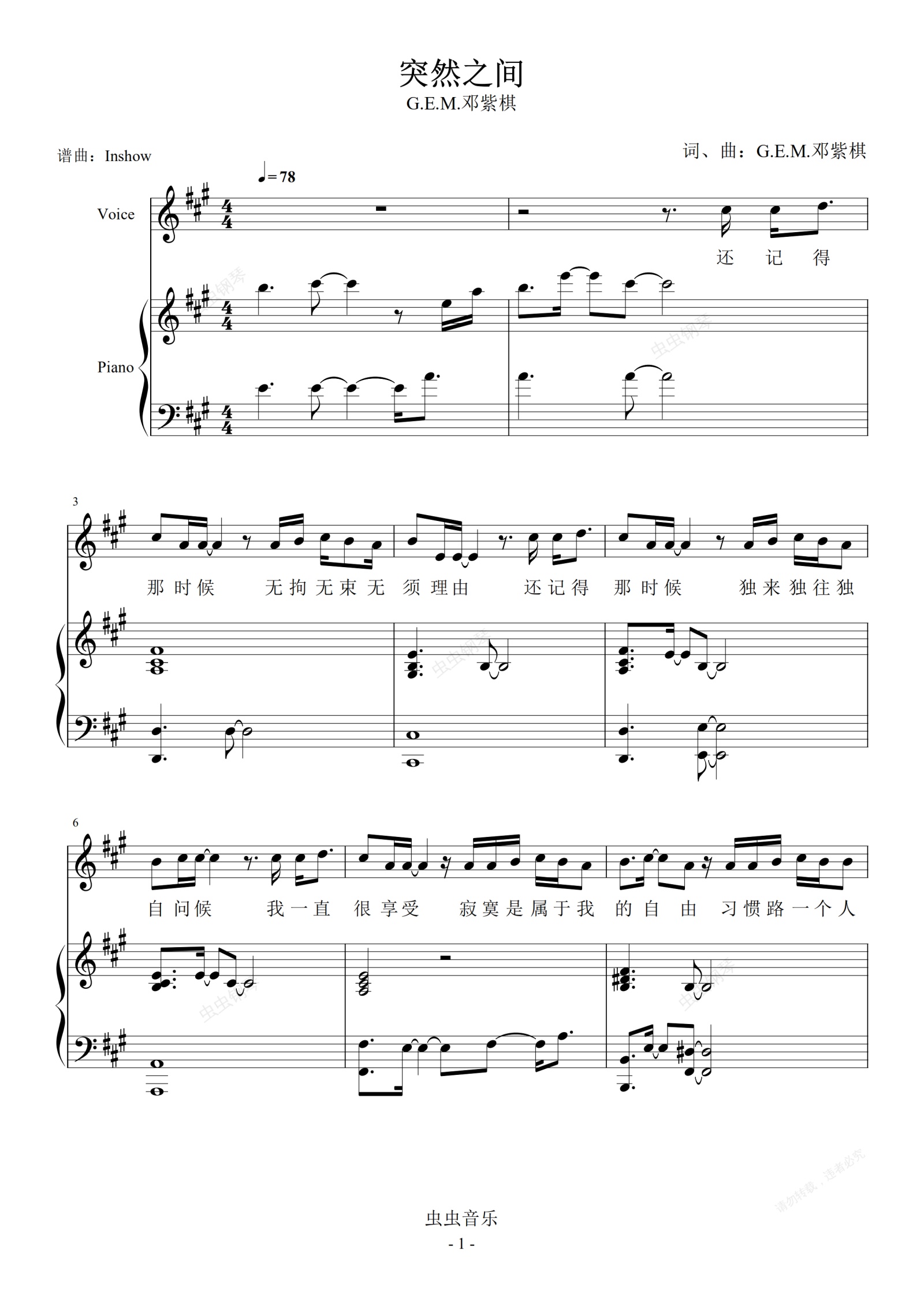 钢琴谱:G.E.M.邓紫棋 - 突然之间【弹唱谱】